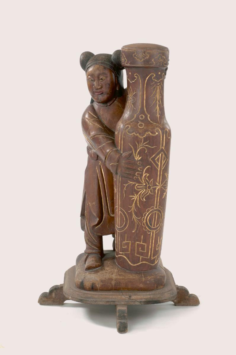 This candle-stand is carved in the shape of ‘jin tong’ (golden boy, attendant to Guanyin). Like most items associated with funerals, they were either discarded or destroyed and are often not kept as treasured family heirloom.