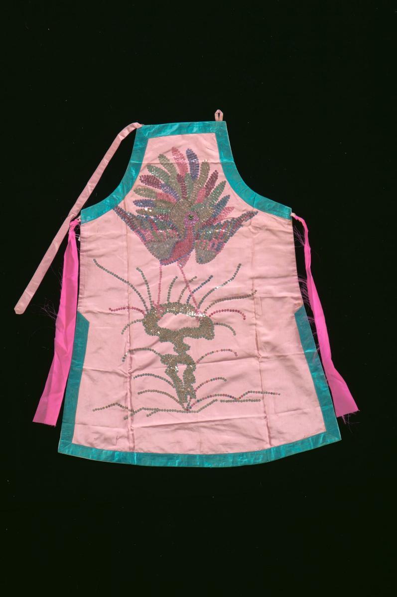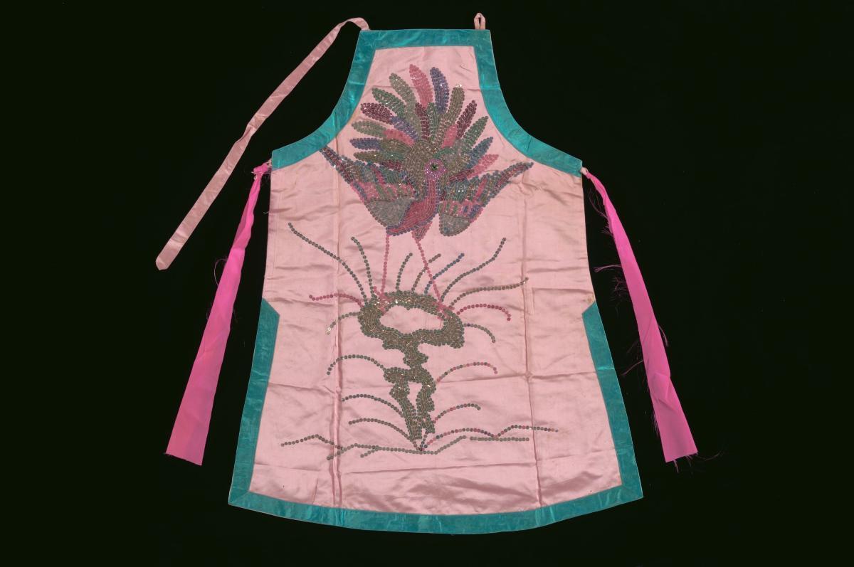 This cream-coloured outer garment is part of a Chinese opera costume (2007-51697). It belonged to the late Singaporean Cantonese opera artists, Mr. Liew Seng Wah and Mdm. Pak Choy Yoke. Mr. Liew was the founder of the now defunct opera company, Kwong Wah Dramatic Troupe. The couple were regional stars during their heyday in the 1930s to 1950s. As celebrated artists, their costumes and accessories were top of the line, with high quality workmanship and intricate designs. Chinese opera, or Chinese ‘wayang’, is a form of theatrical performance. Brought over by immigrants from southeast China to Singapore in the late 19th century, it is performed for both entertainment and religious purposes—both indoors and outdoors. Chinese ‘wayang’ was a popular form of entertainment in Singapore between the 1890s and the early 1930s. Its popularity waned drastically in the 1970s with the emergence of cinema and television. Nonetheless, it is still recognised in Singapore today as traditional culture and an art form.