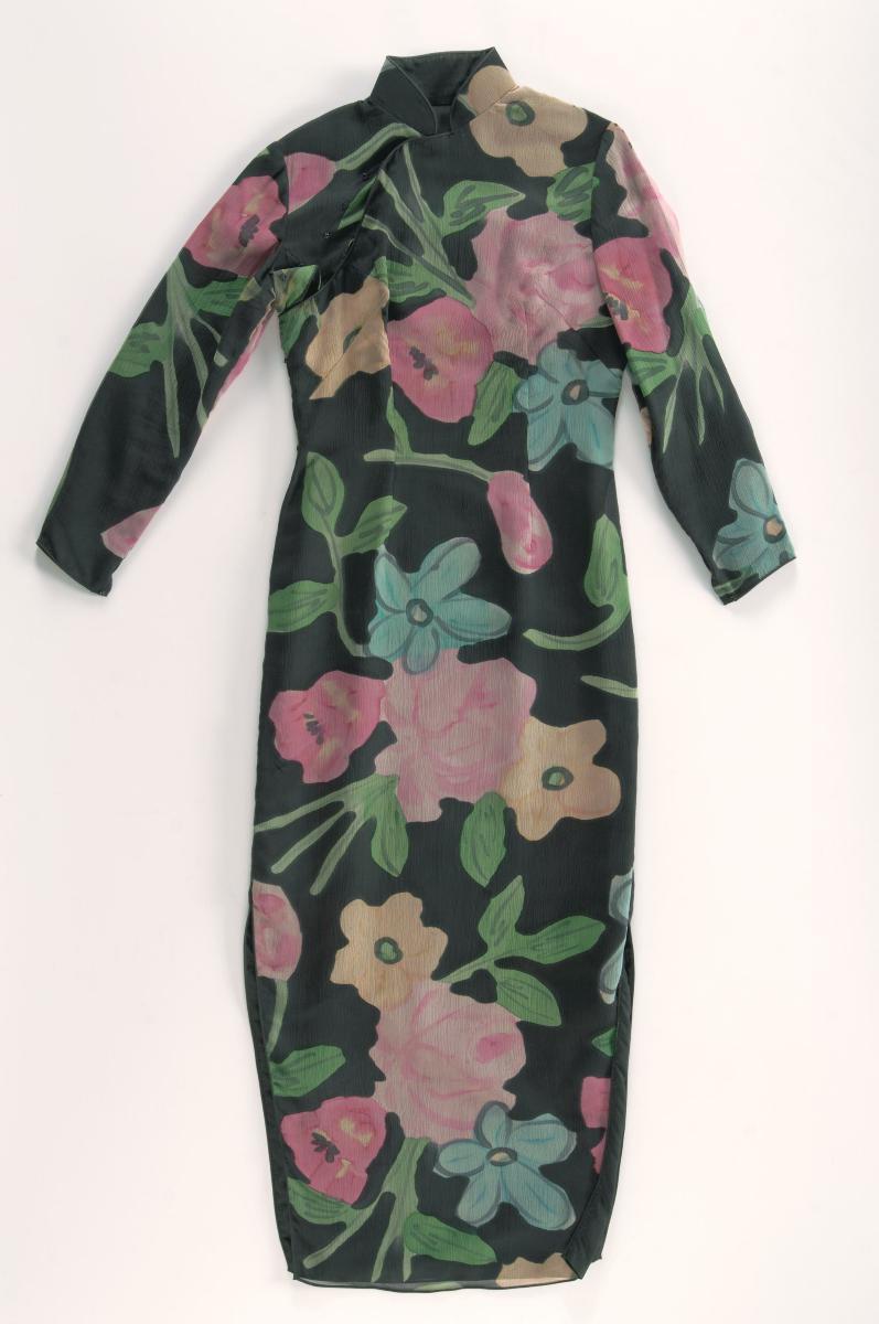 This is a black short-sleeve cheongsam decorated with purple floral motif allover. It is figure hugging and tapered at the bottom, giving the wearer a pencil slim silhouette.This cheongsam belonged to Amy Ede nee Laycock, the adoptive daughter of John Laycock who was instrumental in founding the Singapore Progressive Party in 1947 and later the Liberal Socialist Party in 1956. Amy Ede nee Laycock was one of the earliest women in Singapore to join politics. She won a seat in the Municipal Council in the 1949 elections when she was 26 years old. She quit politics in the mid-1950s, and helped John Laycock to run his orchid garden in Mandai. She has 3 orchid hybrids Aerides Amy, Vanda Amy and Dendrobium Amy Ede named after her.