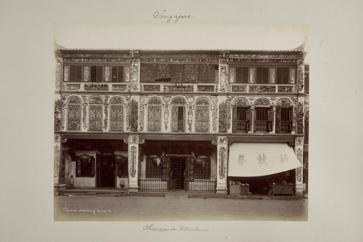 The shophouse is a vernacular architectural building type that is both native and unique to urban Southeast Asia. The architecture, a hybrid form popular in late 19th century Singapore, reflects Victorian cast-iron work for the windows and grilles, carved panels and louvers recalling Malay building tradition and the liberal use of animals, flowers, motifs from legends and inscriptions of Chinese origin. Many shophouses can still be seen today, their exteriors conserved under the law, but with their interiors reflecting 21st century sensibilities.By the late 19th century as the population of Singapore burgeoned, middle-class Straits Chinese families started moving out of the overcrowded central areas of Telok Ayer, Tanjong Pagar, Neil Road and Duxton Hill to areas such as Orchard Road, River Valley Road and Emerald Hill. This photograph shows the row of terraced three-storey shophouses taken by G.R. Lambert & Co.