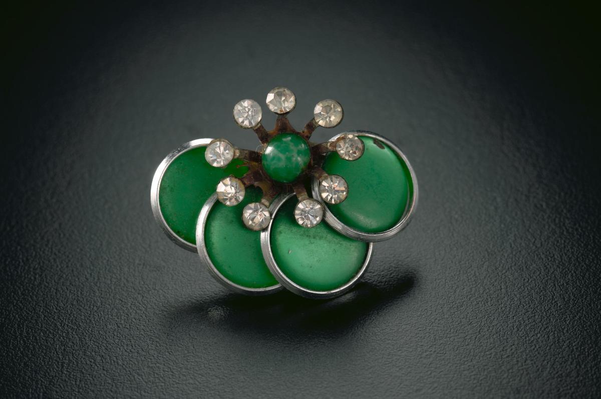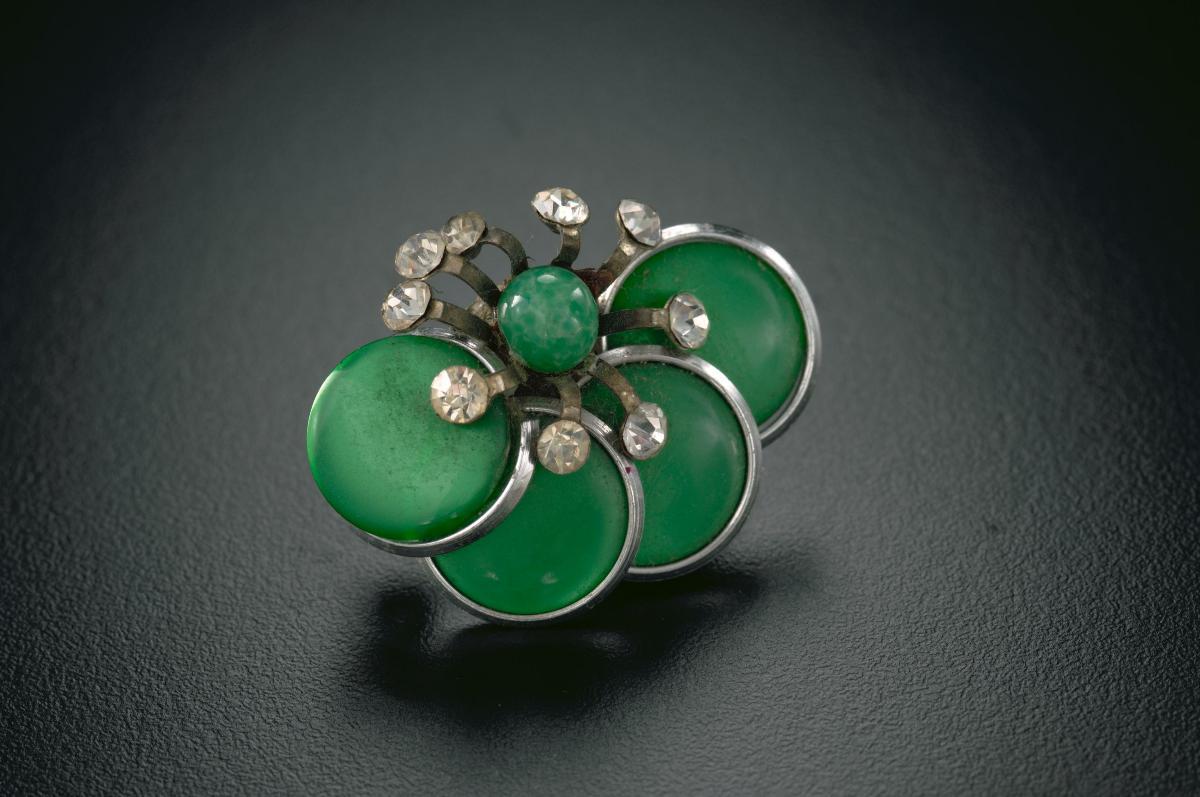 A pair of ear rings decorated with green stones and diamanté that belonged to a notable women's rights activist