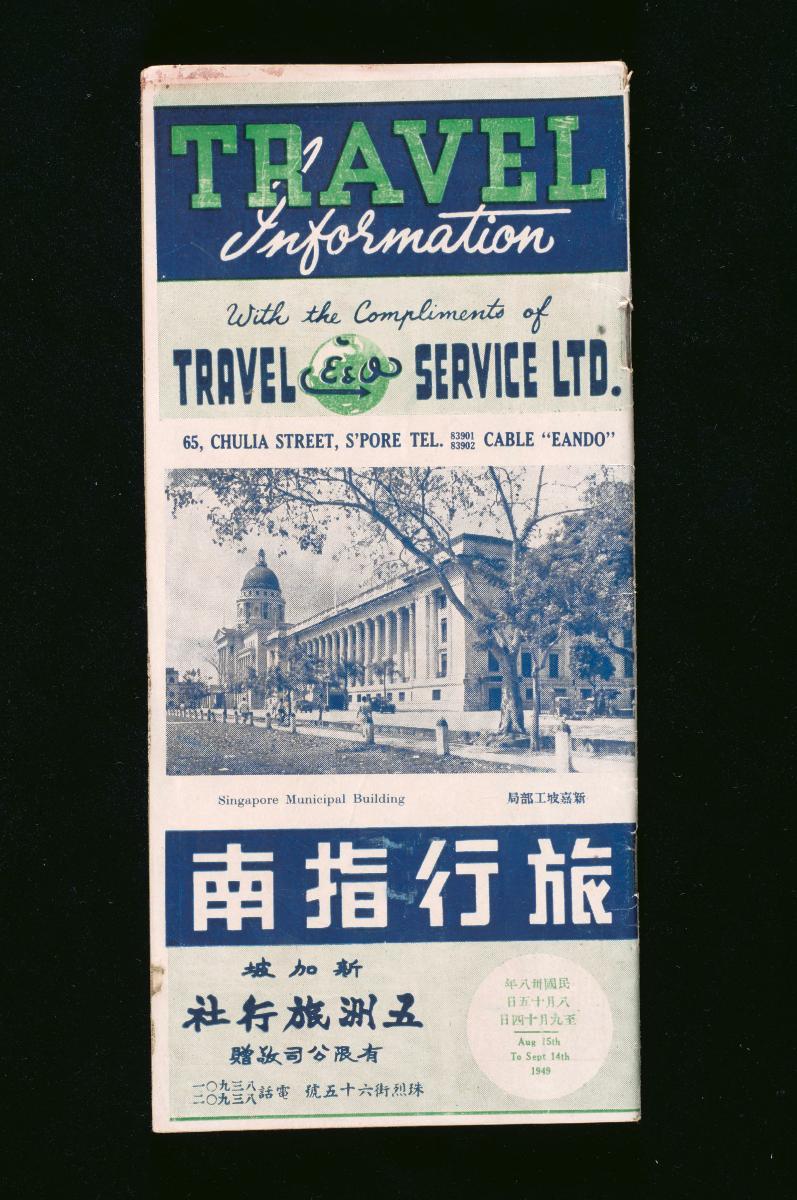 This is a booklet titled ‘Travel Information’ produced by Travel Service Ltd. for tourists visiting Singapore. The guidebook is written in English and Chinese.
