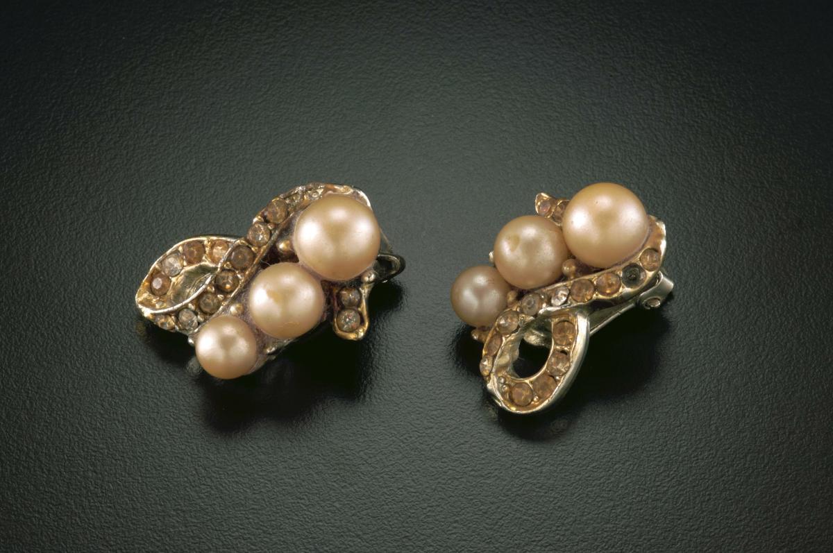 A pair of ear rings with pearls and blue and red crystals that belonged to a notable women's rights activist