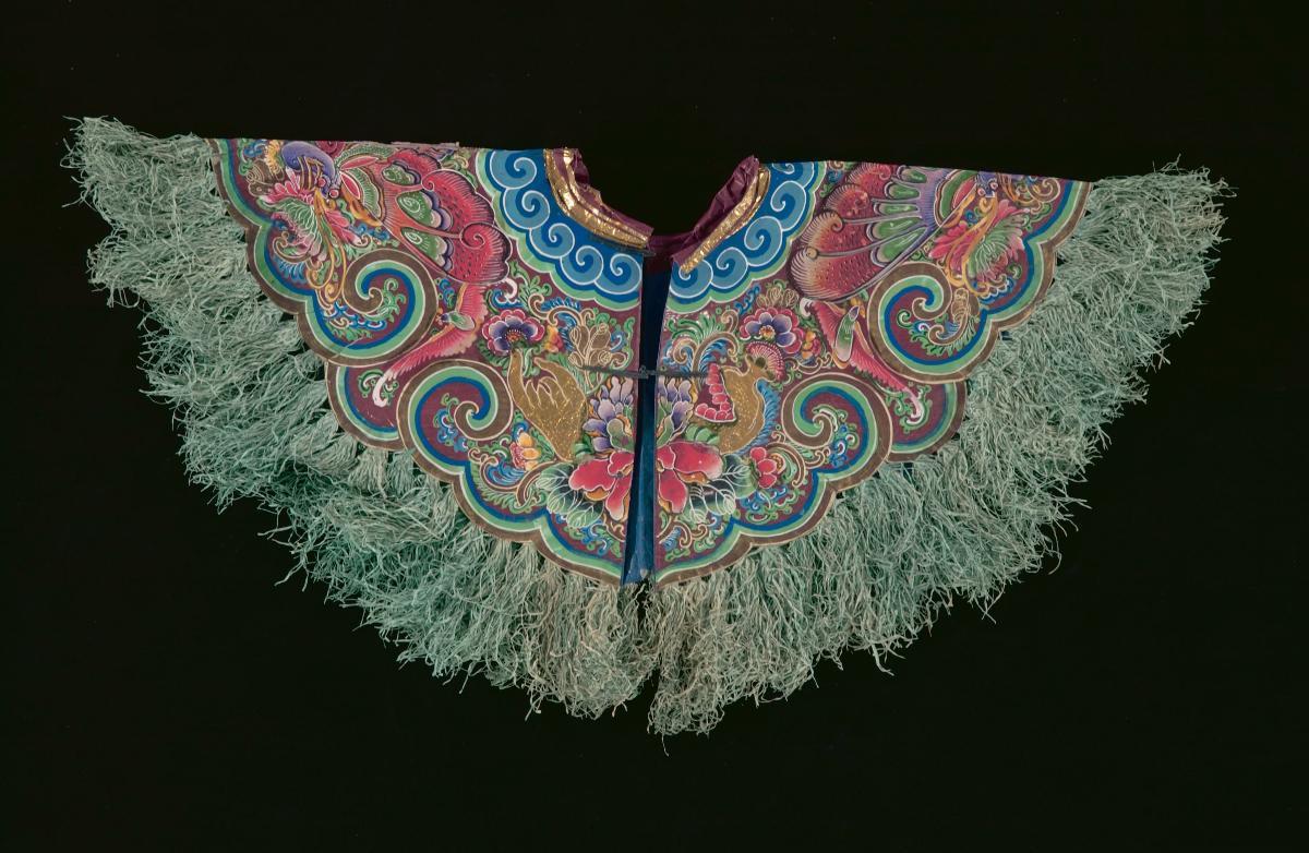 The paper vest and shoulder piece are burnt as offerings to a male deity or ancestor. Burnt offerings are integral to Taoist worship and rituals. Offerings are burnt as gifts during temple festivals to commemorate the birthdays of deities. At Taoist funerals and religious ceremonies, burnt offerings are made to ensure that the deceased, or an ancestor, enjoys a comfortable life in the netherworld. The articles burnt as offerings are made from paper and are often imitations of real objects. They can be purchased from shops dedicated to selling these religious paraphernalia, which are referred to locally as “paper shops”. These shops sell a wide range of items, from elaborately decorated paper houses, cars and furniture, to bank notes and garments. The paper garments are usually life-size and the more elaborate ones follow the iconographic conventions of opera costumes closely. Chinese operas are performed as part of Taoist religious festivities.
