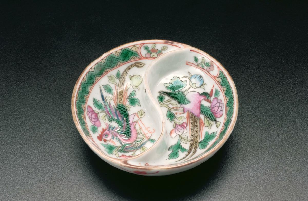 This white ground condiment saucer is decorated with motifs of a phoenix and pink peonies. The phoenix is an auspicious symbol in the Chinese culture representing beauty, grace, high virtue, the bride and the Empress. Likewise, peonies are auspicious symbols that symbolise spring, love, beauty and good fortune. Such overglaze polychrome enamelled porcelain or Nonyaware could be part of the elaborate 'tok panjang' (literally ‘long table’) dinner service which refers to dining at home on special occasions. Such a dinner service could comprise several hundred to several thousand pieces of plates, bowls and spoons of varying sizes.