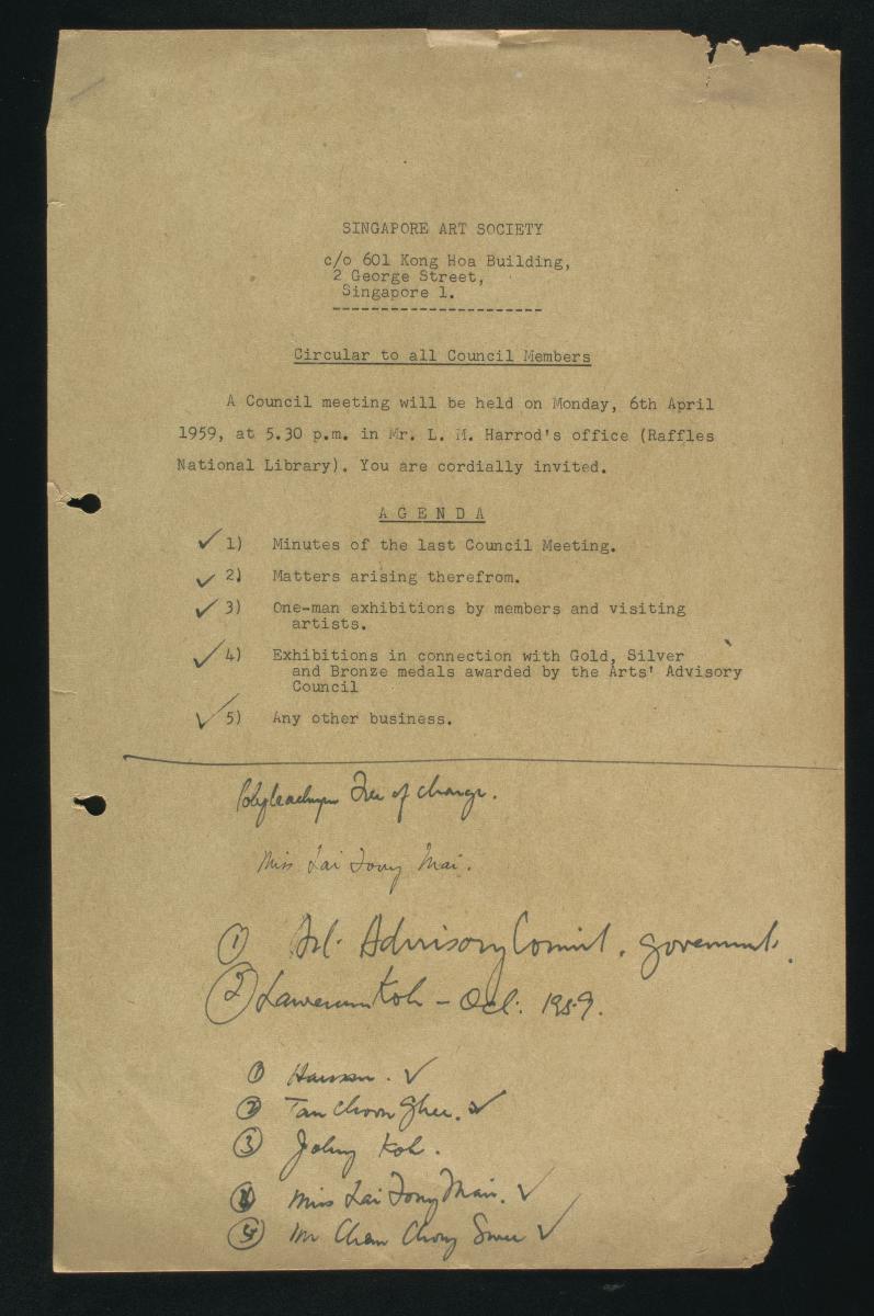 This circular was sent to members of the Singapore Art Society Photographic Group, inviting them to send in their work for display in an upcoming exhibition.The artefact most probably belonged to Ho Kok Hoe, a local architect and artist who learned to paint from his father Ho Kwong Yew, who was also an architect and artist, and his grandfather, who was a calligrapher. The younger Ho was a prominent architect who, while working for the family’s architectural firm Ho Kwong Yew & Sons, was responsible for designing Malaysia’s Muzium Negara (National Museum) in the 1960s. He was also actively involved in the local arts scene, especially during his two stints (1954–1967 and 1981–1983) as president of the Singapore Art Society. The Society was founded in October 1949 to help spread the practice and appreciation of art, improve the quality of local art, promote art exchanges with other countries and create opportunities for artists to learn and exhibit their works. The founding members of the society were, namely: Richard Walker (Art Superintendent); Charles Sulisbury (British Council); C. A. Gibson-Hill (Raffles Library and Museum); Francis Thomas (Chairman, Inter-School Art Exhibition Committee); Liu Kang (President, Society of Chinese Artists); Professor Roy Morell (University of Malaya); Mrs. Phillis Mackenzie; Suri bin Mohyani; and Tan Khoon Seng.