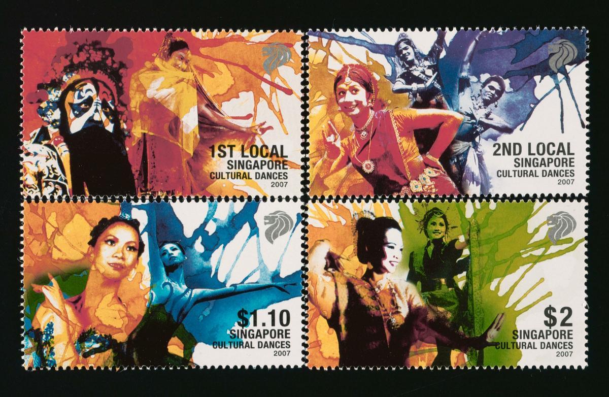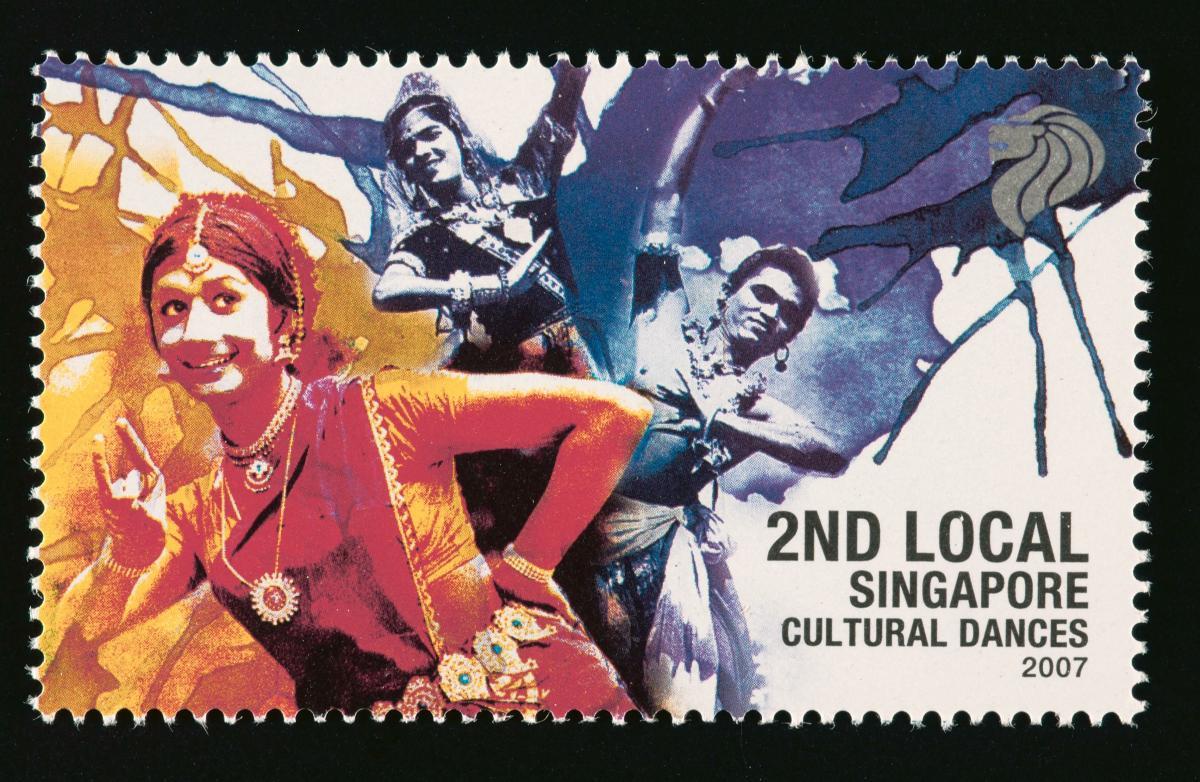 This is a stamp from a set of four titled ‘Cultural Dances’. Each stamp in the set depicts a different cultural dance form in Singapore, namely Chinese, Indian, Western and Malay.