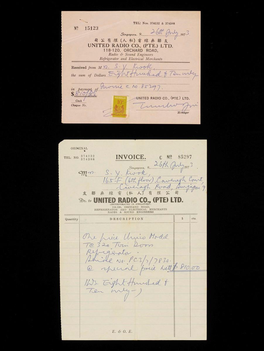 The group of receipts show the type of services that were provided for the donor.The receipts help towards charting consumption and lifestyle patterns in the mid-70sthe receipts are very significant as they show the price that the donor paid for a pair of red Casal chairs - one of which is part of this donation.