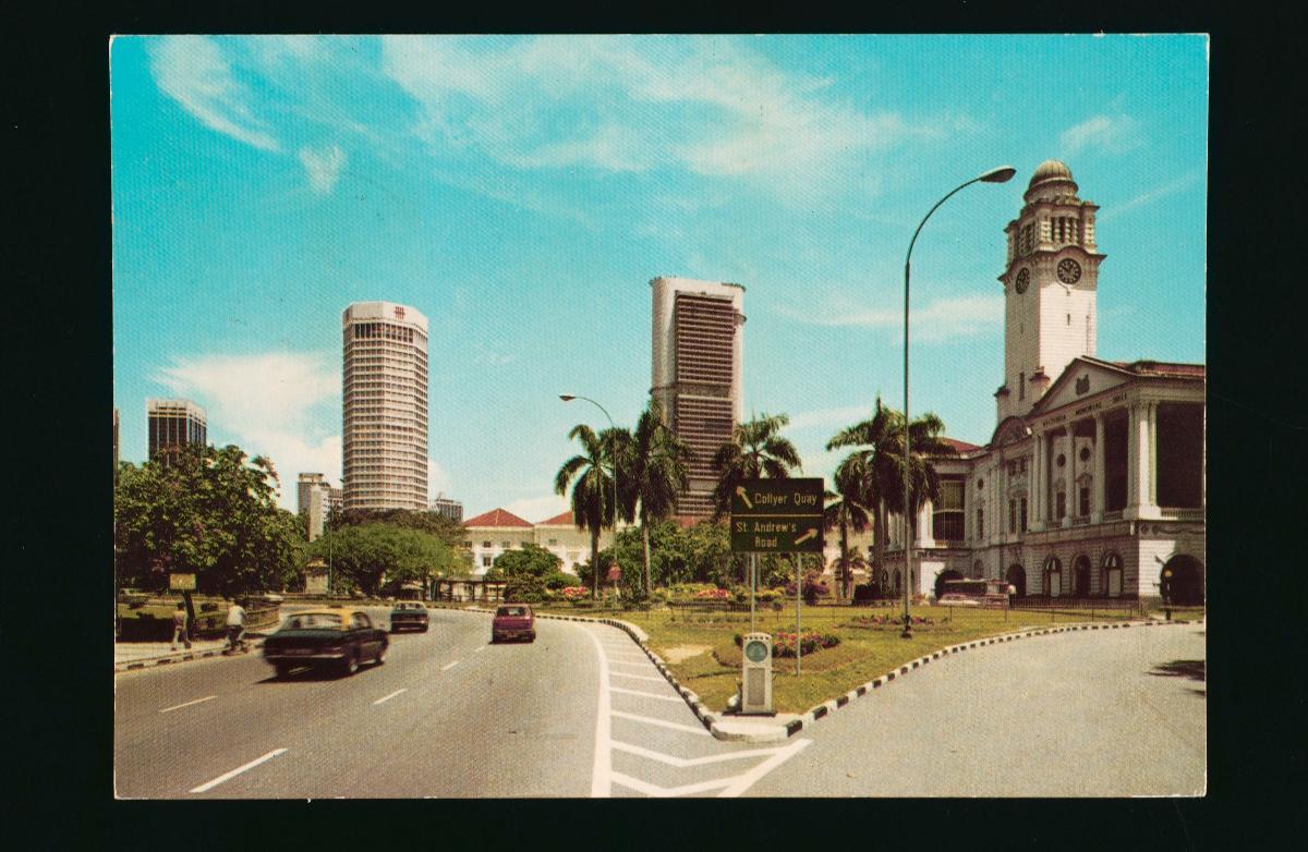 This postcard shows a view of the Civilian War Memorial (centre foreground). The four-pillared structure was erected in 1967 on a piece of parkland along Beach Road as a monument dedicated to the memory of those civilians who died during the Japanese Occupation of Singapore (1942-1945). The project was jointly funded by the Singapore government using part of the $25 million atonement fund received from the Japanese government, and the Singapore Chinese Chamber of Commerce.In the background is the Central Business District (CBD) skyline with its towering skyscrapers. The CBD area on the south bank of the Singapore River underwent major redevelopment in the late 1960s and 1970s as part of the government’s urban renewal scheme for the old city centre. One of the prominent buildings erected in the CBD area as part of the renewal project was the 52-storey Oversea-Chinese Banking Corporation (OCBC) Centre completed in 1976 (right background).