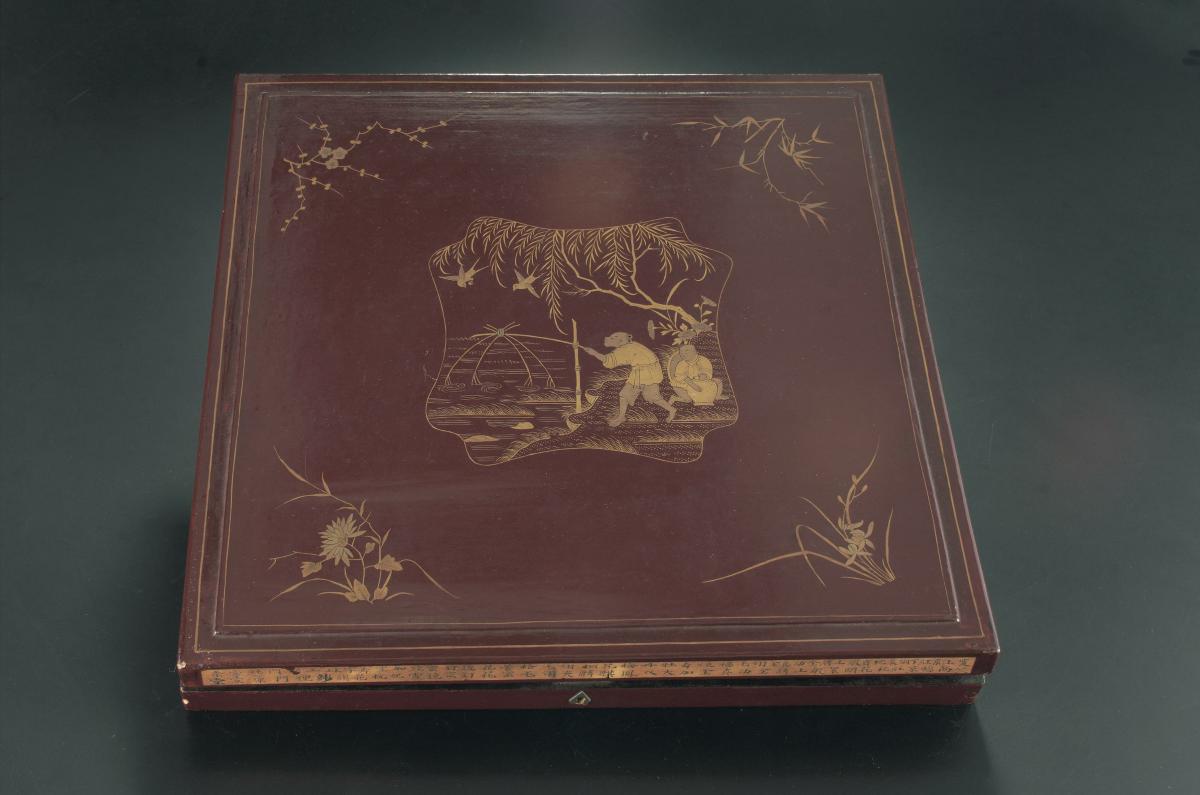 This is an embroidery box, possibly crafted from teak. It could be used to store the various tools and materials used in embroidery, such as silk threads. The painted motifs in gold include two Chinese men fishing by the river and under a large tree. A pair of birds fly slightly above. Embroidery and beadwork was a necessary skill for the Nyonyas before the war and served as a social function.