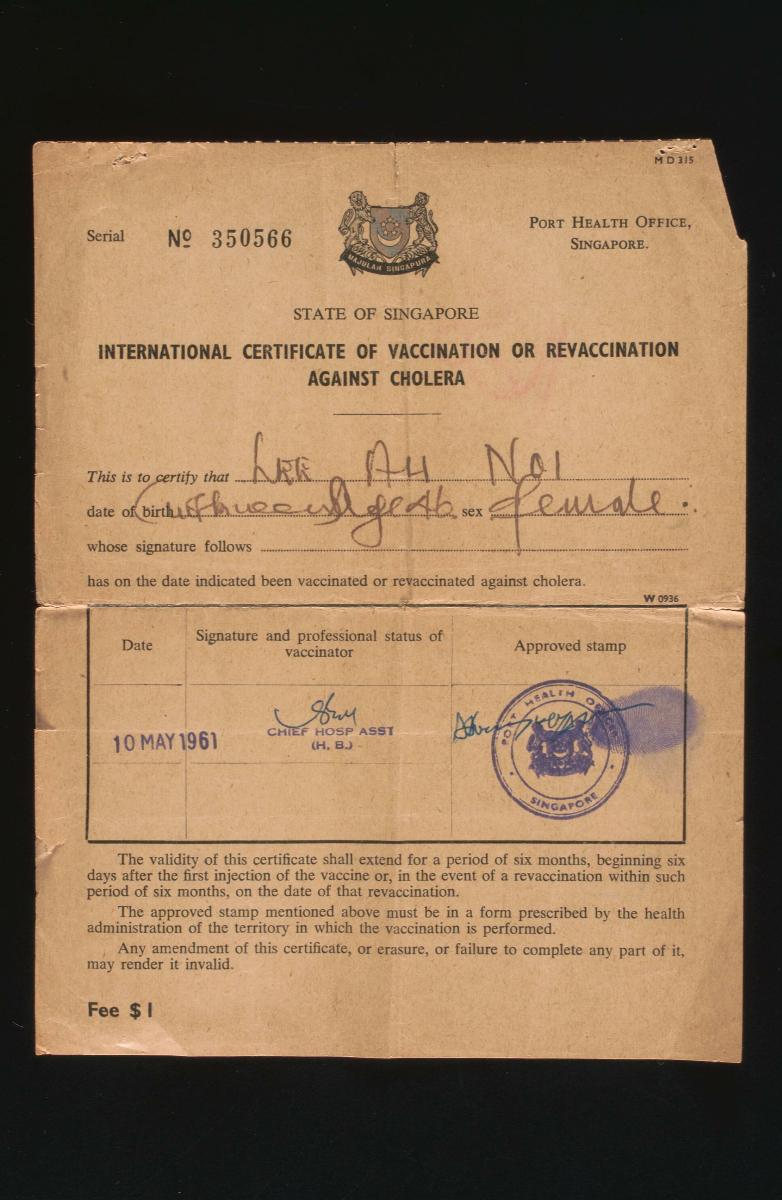 This vaccination certificate for anti-cholera inoculation was one of the travel documents issued by the Swatow quarantine station to Mdm. Lee Ah Noi when she left China for Singapore in 1937.