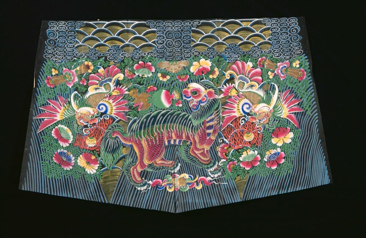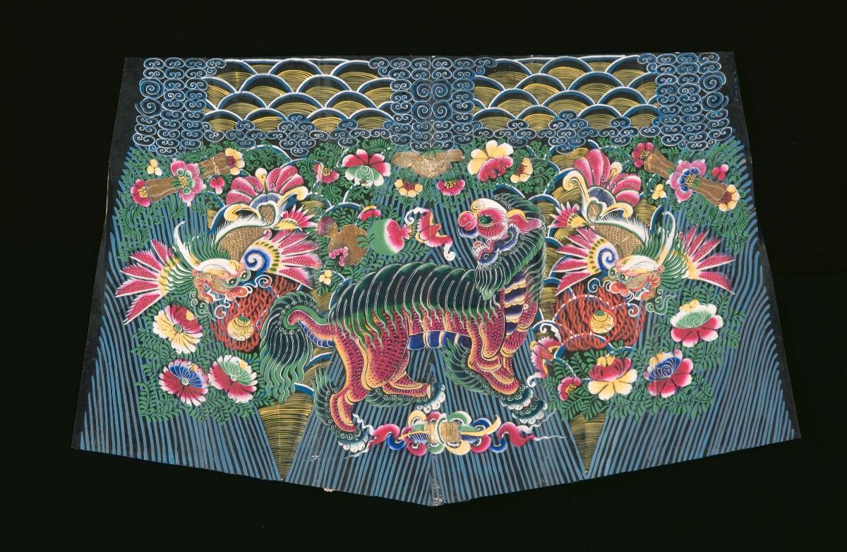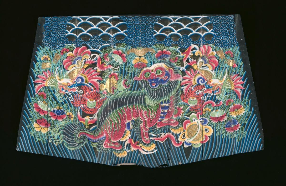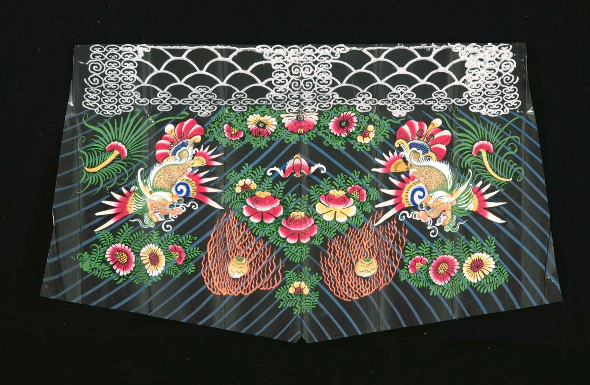 This paper cut-out with a dragon motif is used to form a paper robe. The robe is burnt as an offering to a male deity. Burnt offerings are integral to Taoist worship and rituals. Offerings are burnt as gifts during temple festivals to commemorate the birthdays of gods and deities. At Taoist funerals, burnt offerings are made to ensure that the deceased enjoys a comfortable life in the netherworld. The articles burnt as offerings are made from paper and are often imitations of real objects. They can be purchased from shops dedicated to selling these religious paraphernalia, which are referred to locally as “paper shops”. These shops sell a wide range of items, from elaborately decorated paper houses, cars and furniture, to bank notes and garments. The paper garments are usually life-size. They follow closely the iconographic conventions of opera costumes. Chinese operas are performed as entertainment for the gods as part of Taoist religious festivities.