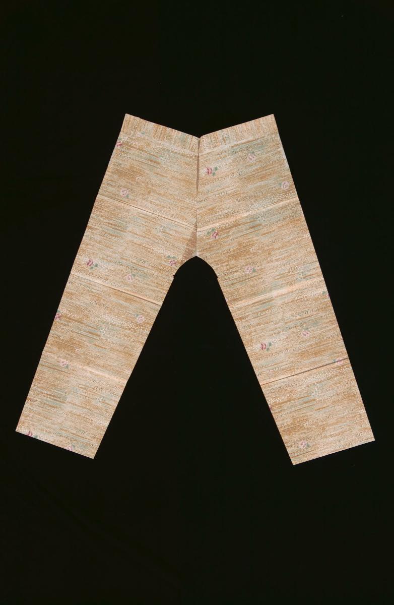 This paper ensemble comprising of a collared blouse and a pair of pants is burnt as an offering to a female ancestor or deceased. Burnt offerings are integral to Taoist worship and rituals. Offerings are burnt as gifts during temple festivals to commemorate the birthdays of deities. At Taoist funerals and religious ceremonies, burnt offerings are made to ensure that the deceased, or an ancestor, enjoys a comfortable life in the netherworld. The articles burnt as offerings are made from paper and are often imitations of real objects. They can be purchased from shops dedicated to selling these religious paraphernalia, which are referred to locally as “paper shops”. These shops sell a wide range of items, from elaborately decorated paper houses, cars and furniture, to bank notes and garments. The paper garments are usually life-size and the more elaborate ones follow the iconographic conventions of opera costumes closely. Chinese operas are performed as part of Taoist religious festivities.