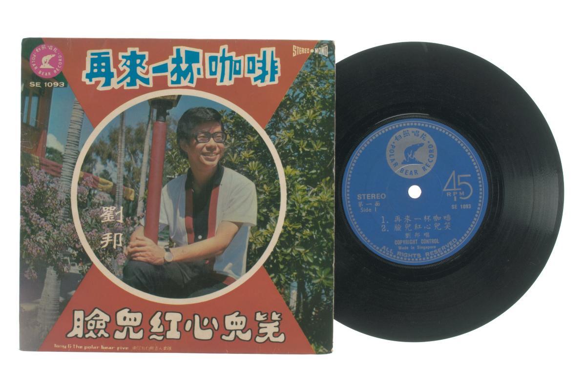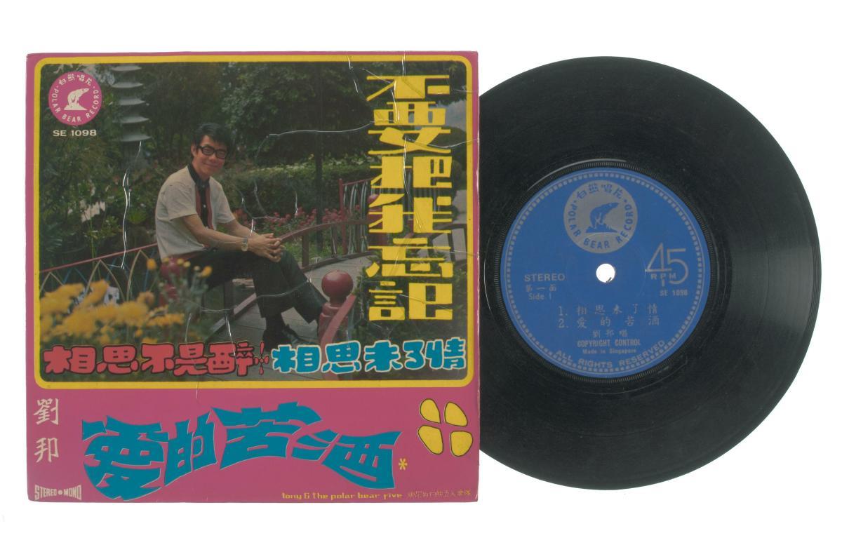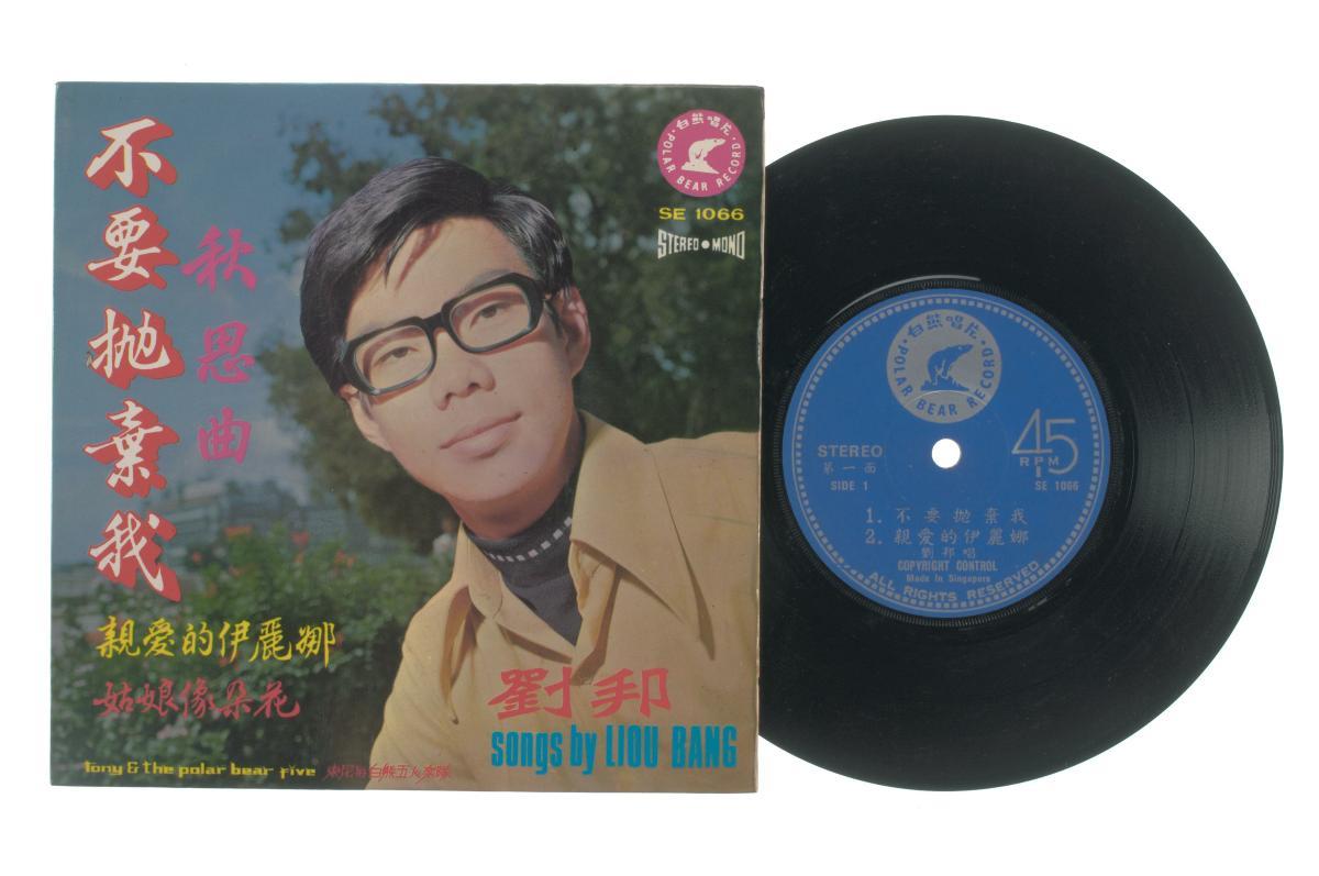This 45 rpm record was produced by Polar Bear Record. Liou Bang emerged as the champion in a singing competition held by the Kreta Ayer People’s Theatre in 1969. He was nicknamed ‘King of Pop of Kreta Ayer’.