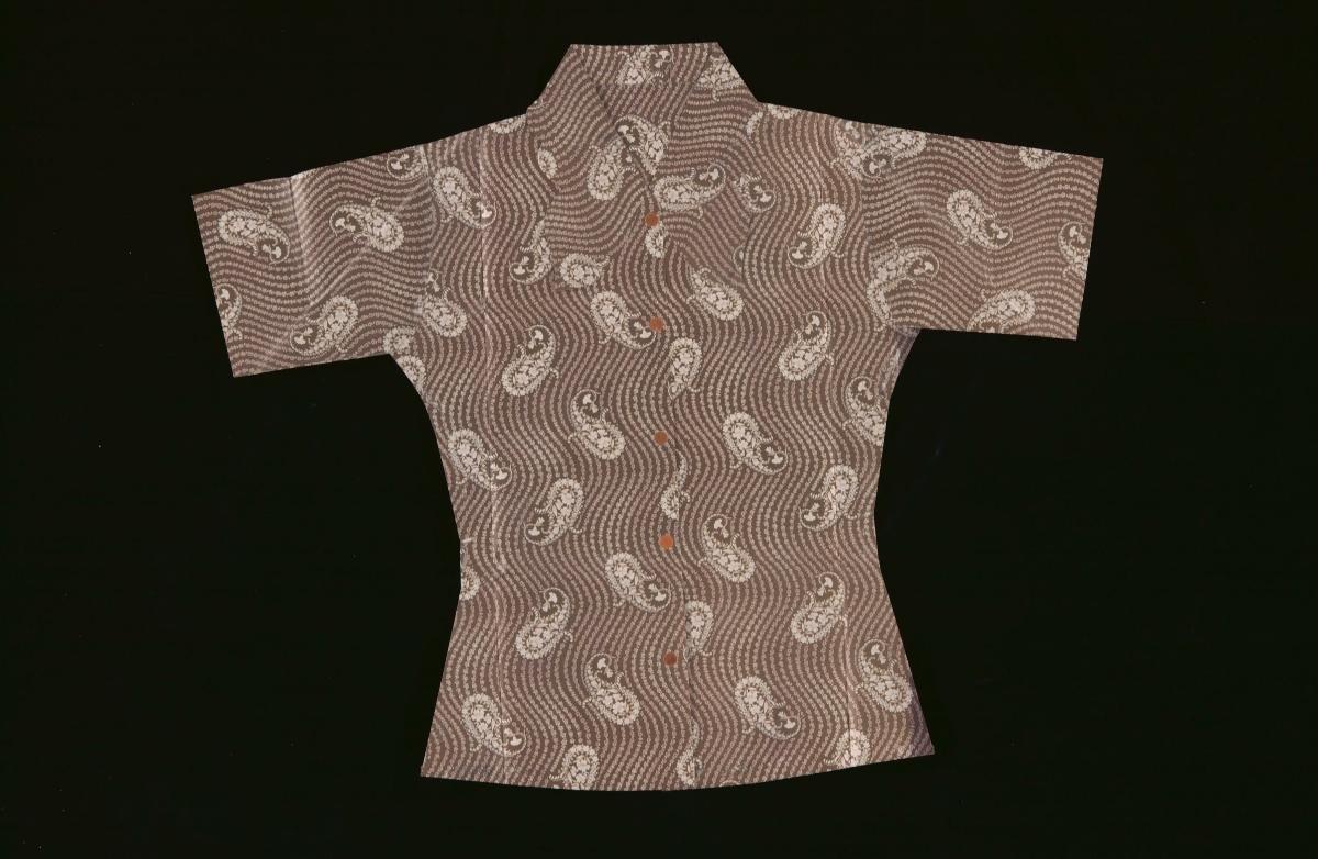 This paper ensemble comprising of a collared blouse and a pair of pants is burnt as an offering to a female ancestor or deceased.Burnt offerings are integral to Taoist worship and rituals. Offerings are burnt as gifts during temple festivals to commemorate the birthdays of deities. At Taoist funerals and religious ceremonies, burnt offerings are made to ensure that the deceased, or an ancestor, enjoys a comfortable life in the netherworld. The articles burnt as offerings are made from paper and are often imitations of real objects. They can be purchased from shops dedicated to selling these religious paraphernalia, which are referred to locally as “paper shops”. These shops sell a wide range of items, from elaborately decorated paper houses, cars and furniture, to bank notes and garments. The paper garments are usually life-size and the more elaborate ones follow the iconographic conventions of opera costumes closely. Chinese operas are performed as part of Taoist religious festivities.