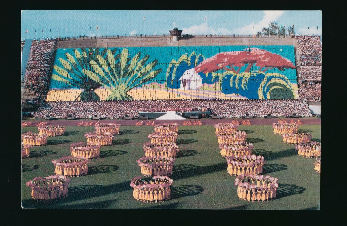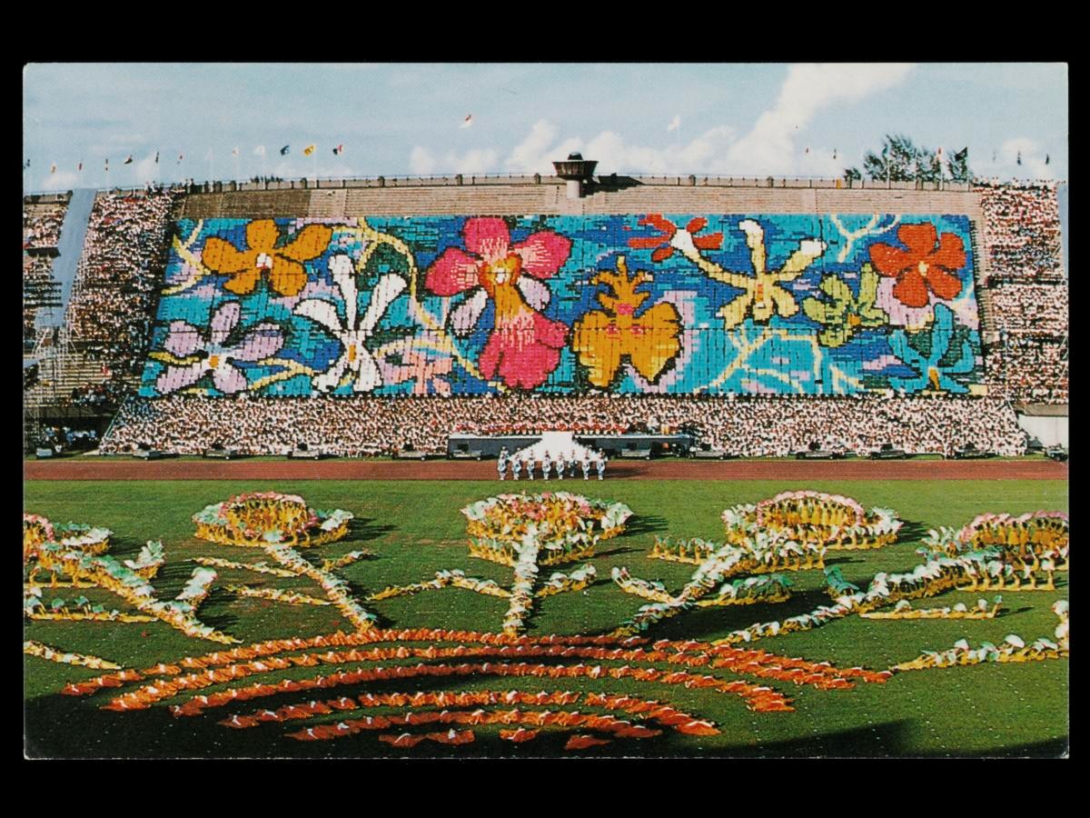The 1988 edition of the Singapore Youth Festival (SYF), an annual event for promoting student involvement in non-academic activities, was officially launched on 9 July 1988 in a grand opening ceremony held at the National Stadium. The ceremony, which was presided over by then Minister for Education Dr. Tony Tan, included the following performance items: a flashcard display of 13 murals created by 5,200 students; a combined uniform groups parade led by the National Cadet Corps; a flag drill conducted by over 1,400 boys; a fan dance involving some 1,000 girls; a nine-band combined display with 150 female dancers; and a 2,200-strong choir singing patriotic numbers.The inaugural SYF was launched on 18 July 1967 by then President Yusof Ishak at the Jalan Besar Stadium. Organised by the Ministry of Education, the two-week long event was meant to showcase the talents of Singapore’s youths and saw the participation of 24,000 students from primary and secondary schools. The festival expanded over the years to include musical performances, art-and-craft exhibitions, and athletic events. In 1994, then Prime Minister Goh Chok Tong elevated the SYF to the status of a national event. The annual festival remains a regular fixture on the national school calendar.