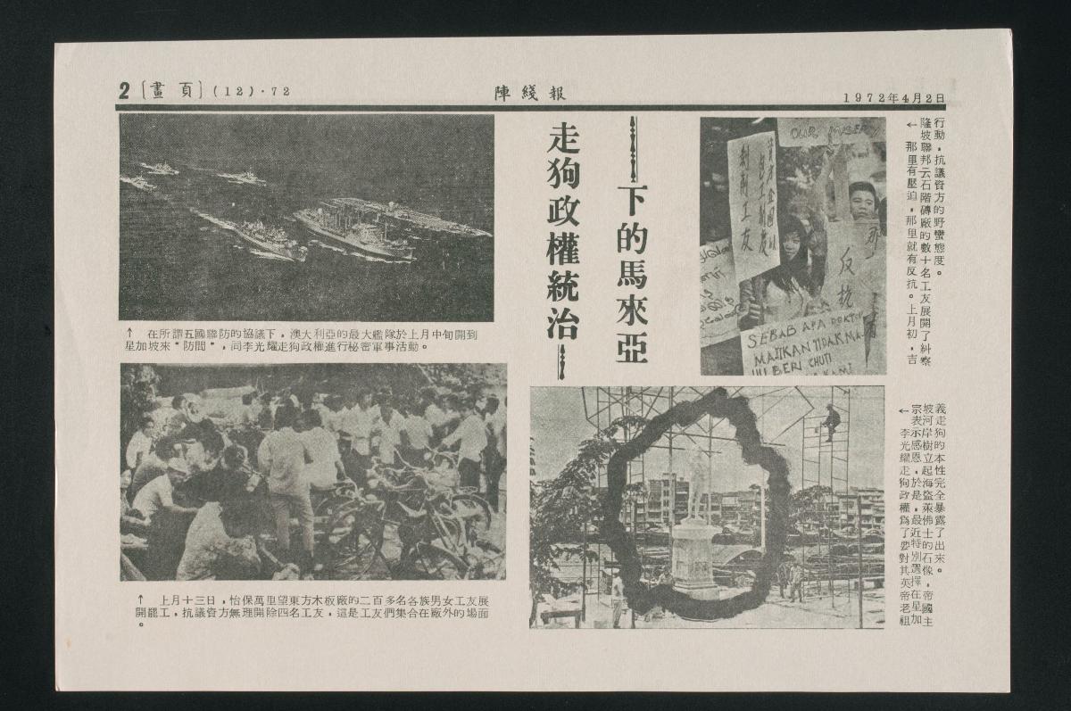 The Barisan Sosialis (Socialist Front) was a political party formed in 1961 by the former left-wing members of the People’s Action Party (PAP). Barisan was led by Lee Siew Choh and Lim Chin Siong, and was the main opposition party in self-governing Singapore. In the 1963 General Elections, the party won 13 of the 51 seats contested. In the 1965 by-elections, the PAP had a decisive win over Barisan. The party boycotted the 1968 elections, only to contest in the 1972 elections with no success. Barisan Sosialis eventually dissolved in 1988.