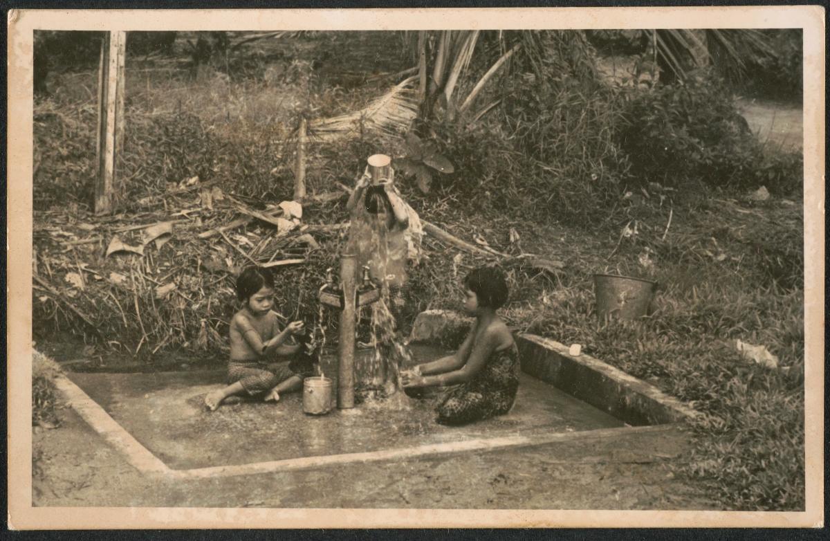 This photograph shows a father and child bathing in a bathtub.The photograph is part of a series of shots taken during the German East Asia Naval Squadron’s tour of East and Southeast Asia in 1908, which included stops in Singapore, Labuan, Johor and North Borneo.