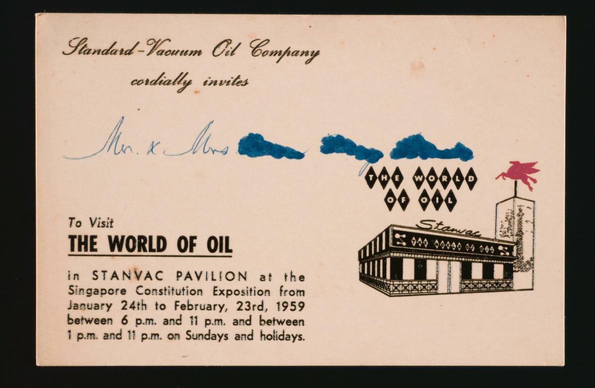 This is an invitation card given to a guest of the Singapore Constitution Exposition, which was opened on 31 January 1959 by Chief Minister Lim Yew Hock. The Exposition was a large event that lasted for two months, with the aim of commemorating Singapore’s transition from colonial status to self-government. About 450 exhibiting booths and 3,000 participants, including government boards, industrialists and merchants, participated in the event.