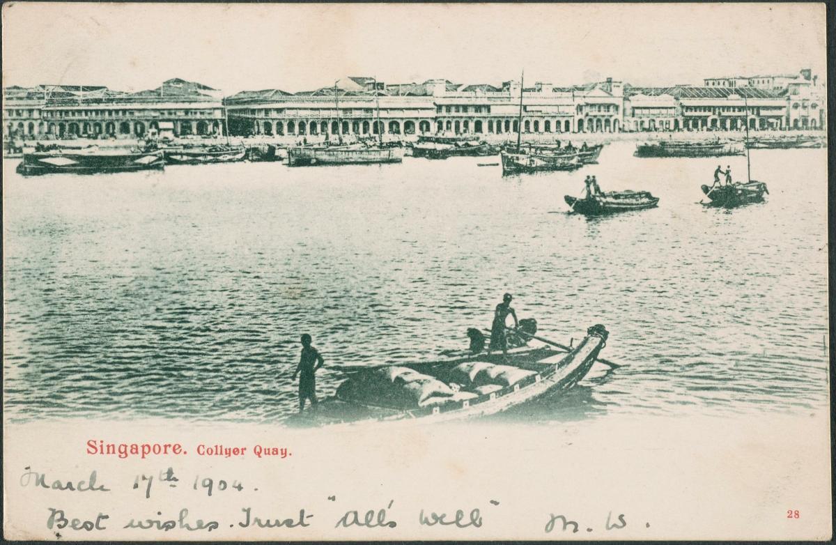 The stretch of seafront known as Collyer Quay resulted from land reclamation works carried out in the 1860s to allow for the erection of office buildings and godowns along the quayside. Prominent buildings lining the busy waterfront in the mid 1970s included: Change Alley Aerial Plaza (second from left), erected in 1970 with its futuristic revolving tower; the 15-storey Shell House (third room left), completed in 1960 to house the oil firm’s employees; and the Maritime Building with its classical facade and tower (right), which was unveiled in 1925 as the Union Building to serve as the office premises of the Union Insurance Society of Canton. In the distance stood the 30-storey United Overseas Bank Building, the tallest landmark in the city centre when it was completed in 1974 (centre background). Along the shoreline was Clifford Pier (right foreground), opened in 1933 and named after Sir Hugh Charles Clifford, Governor of the Straits Settlements (1927-1929).