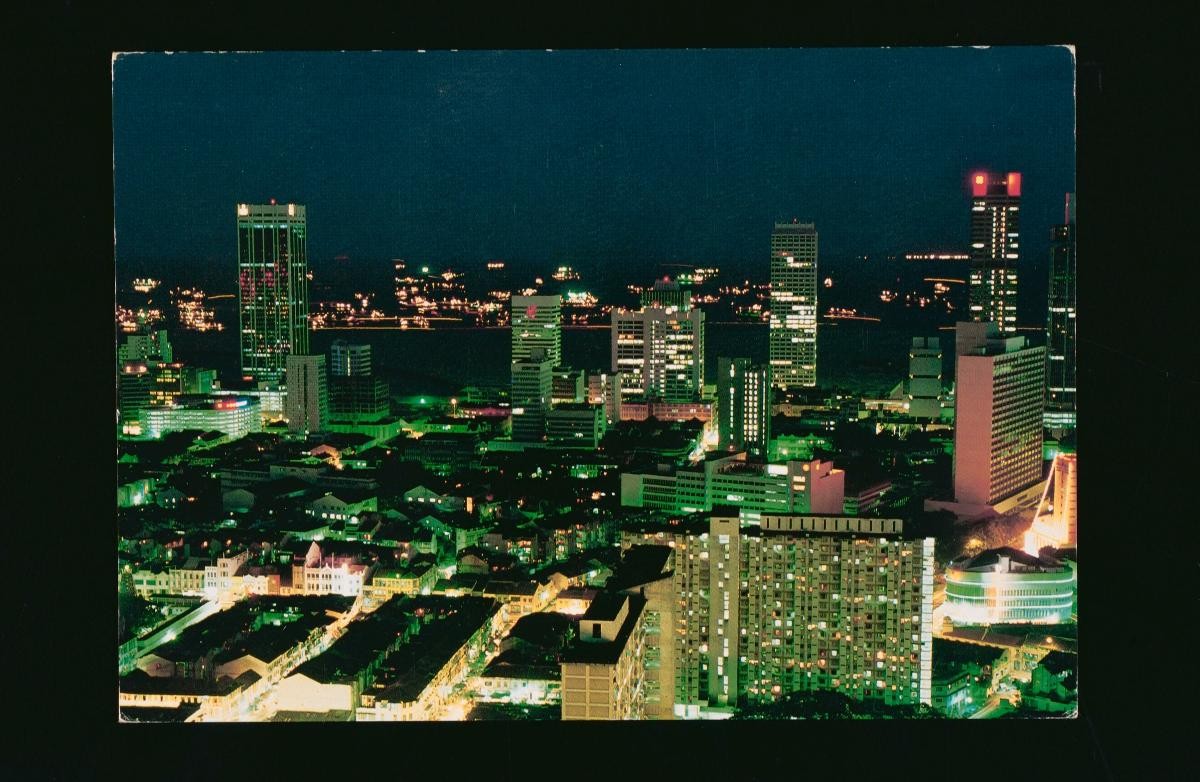This night-time view of the city centre was probably taken from the Ministry of National Development building at Maxwell Road, which was completed and occupied by the Ministry in 1970. The two roads with traffic are likely Amoy Street (left) and Telok Ayer Street (centre). The 30-storey United Overseas Bank Building was the tallest landmark in the city centre when it was completed in 1974 (centre background). Another prominent structure was the eight-storey carpark, opened in 1964, on a triangular site bounded by Cecil, Market and Cross Streets (right centre).In 1965, the Housing and Development Board (HDB) announced a five-year urban renewal plan to rejuvenate the old city centre. Renewal of the city centre was urgently needed as the area was undergoing decay due to poor traffic flow, overcrowding, lack of amenities and inefficient land usage. The renewal plan involved the redevelopment of dilapidated two-storey shophouses, the construction of new multi-storey structures, and the paving of wider roads. In 1966, the Urban Renewal Department was formed within HDB to manage the various redevelopment projects. By the late 1960s, the rebuilding of the city centre was in full swing. A separate government body, the Urban Redevelopment Authority, was formed in 1974 to take over the planning and management of redevelopment projects in the city area.