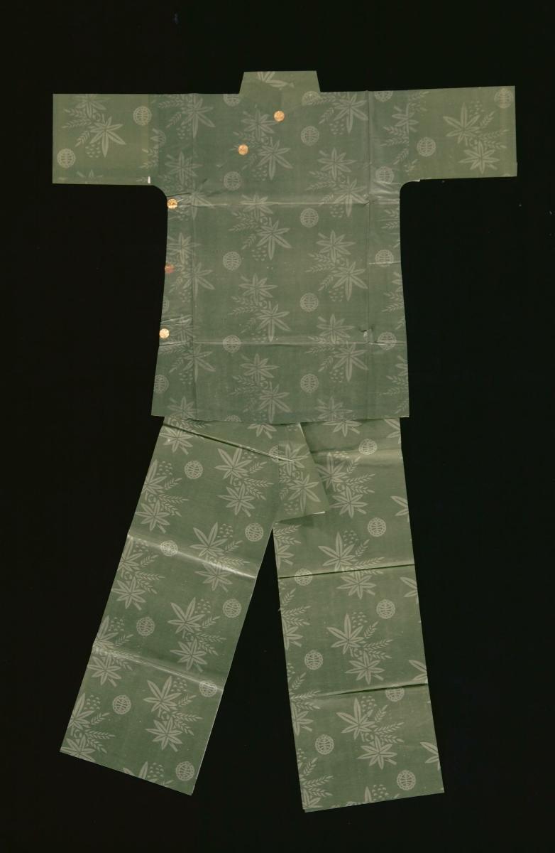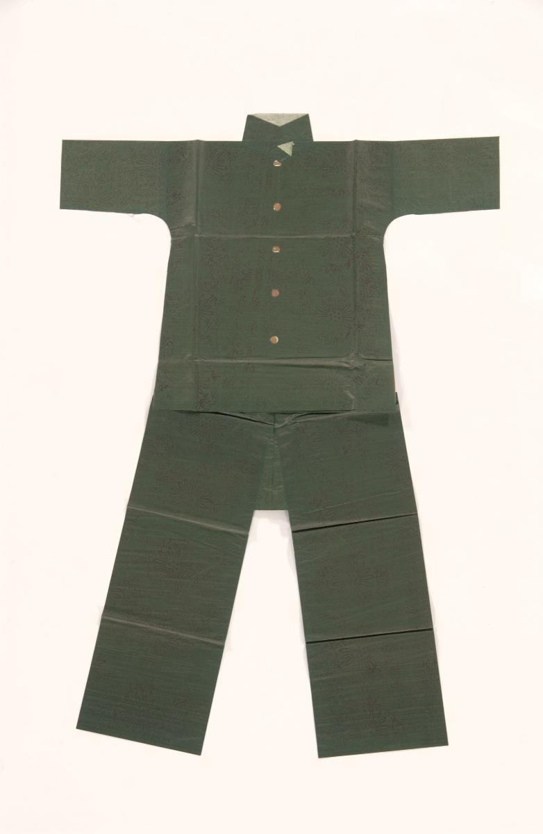 This pair of paper pants is burnt as an offering to a male ancestor or deceased. Burnt offerings are integral to Taoist worship and rituals. Offerings are burnt as gifts during temple festivals to commemorate the birthdays of deities. At Taoist funerals and religious ceremonies, burnt offerings are made to ensure that the deceased, or an ancestor, enjoys a comfortable life in the netherworld. The articles burnt as offerings are made from paper and are often imitations of real objects. They can be purchased from shops dedicated to selling these religious paraphernalia, which are referred to locally as “paper shops”. These shops sell a wide range of items, from elaborately decorated paper houses, cars and furniture, to bank notes and garments. The paper garments are usually life-size and the more elaborate ones follow the iconographic conventions of opera costumes closely. Chinese operas are performed as part of Taoist religious festivities.