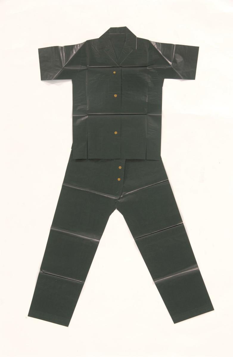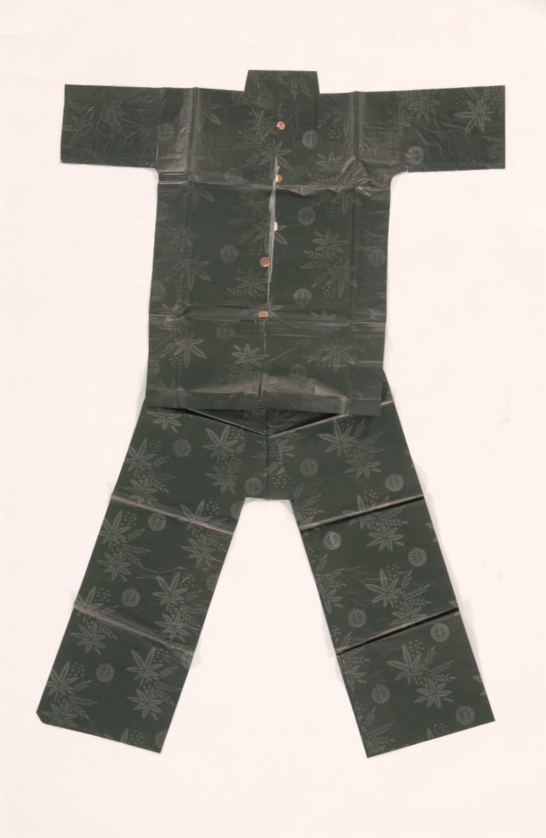 This pair of paper pants is burnt as an offering to a male ancestor or deceased.Burnt offerings are integral to Taoist worship and rituals. Offerings are burnt as gifts during temple festivals to commemorate the birthdays of deities. At Taoist funerals and religious ceremonies, burnt offerings are made to ensure that the deceased, or an ancestor, enjoys a comfortable life in the netherworld. The articles burnt as offerings are made from paper and are often imitations of real objects. They can be purchased from shops dedicated to selling these religious paraphernalia, which are referred to locally as “paper shops”. These shops sell a wide range of items, from elaborately decorated paper houses, cars and furniture, to bank notes and garments. The paper garments are usually life-size and the more elaborate ones follow the iconographic conventions of opera costumes closely. Chinese operas are performed as part of Taoist religious festivities.