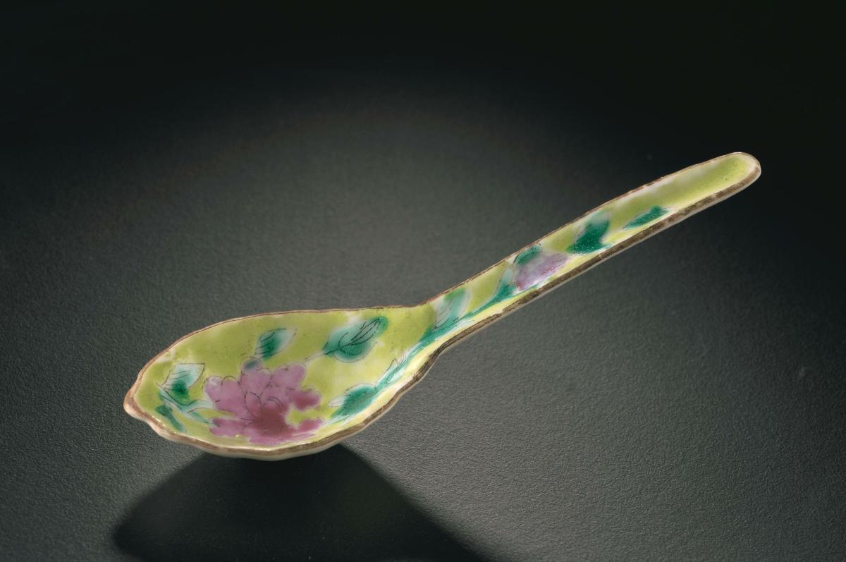 Peranakans use mainly two types of porcelain spoons particularly for soups and dessert. Soup spoons such as this example are larger. There are variations in the design of each type of spoon. Some soup spoons have the shape of a ‘cobra-head’. Motifs range from floral to blackbird to phoenix to butterfly. Dessert spoons are used with dessert bowls in the serving of Peranakan desserts such as 'chendol', 'tai bak' and 'biji delima'.