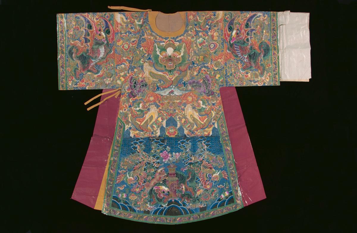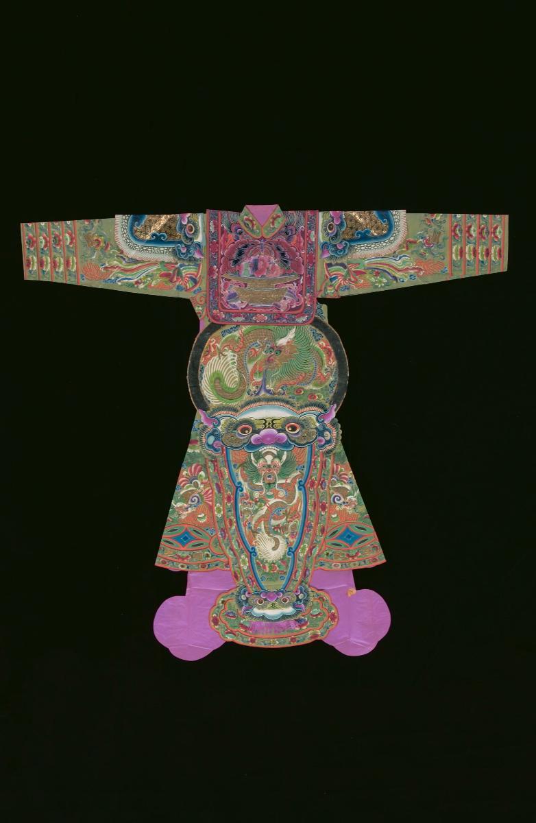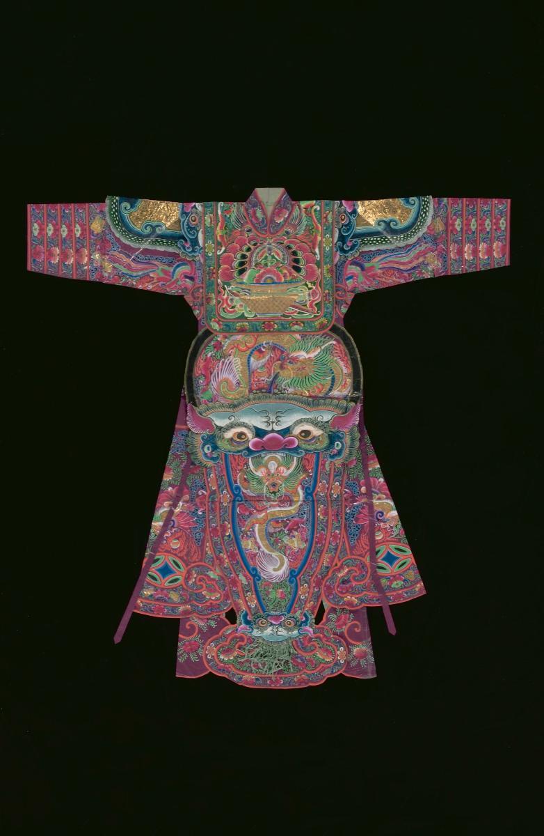 This paper robe with elaborate motifs is burnt as an offering to a deity or an ancestor. Burnt offerings are integral to Taoist worship and rituals. Offerings are burnt as gifts during temple festivals to commemorate the birthdays of deities. At Taoist funerals and religious ceremonies, burnt offerings are made to ensure that the deceased, or an ancestor, enjoys a comfortable life in the netherworld. The articles burnt as offerings are made from paper and are often imitations of real objects. They can be purchased from shops dedicated to selling these religious paraphernalia, which are referred to locally as “paper shops”. These shops sell a wide range of items, from elaborately decorated paper houses, cars and furniture, to bank notes and garments. The paper garments are usually life-size and the more elaborate ones follow the iconographic conventions of opera costumes closely. Chinese operas are performed as part of Taoist religious festivities.