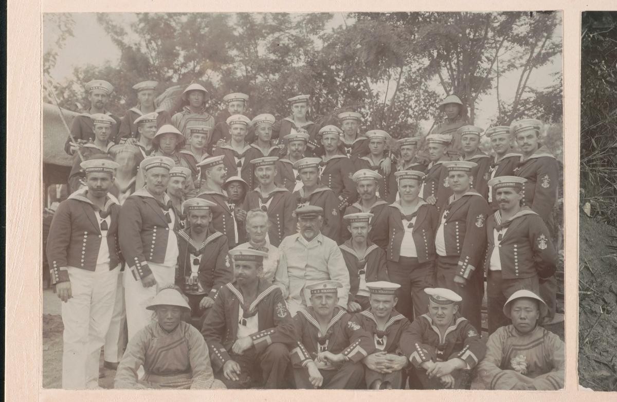 This photograph shows German sailors posing with Malay villagers outside a kampong house.The photograph is part of a series of shots taken during the German East Asia Naval Squadron’s tour of East and Southeast Asia in 1908, which included stops in Singapore, Labuan, Johor and North Borneo.