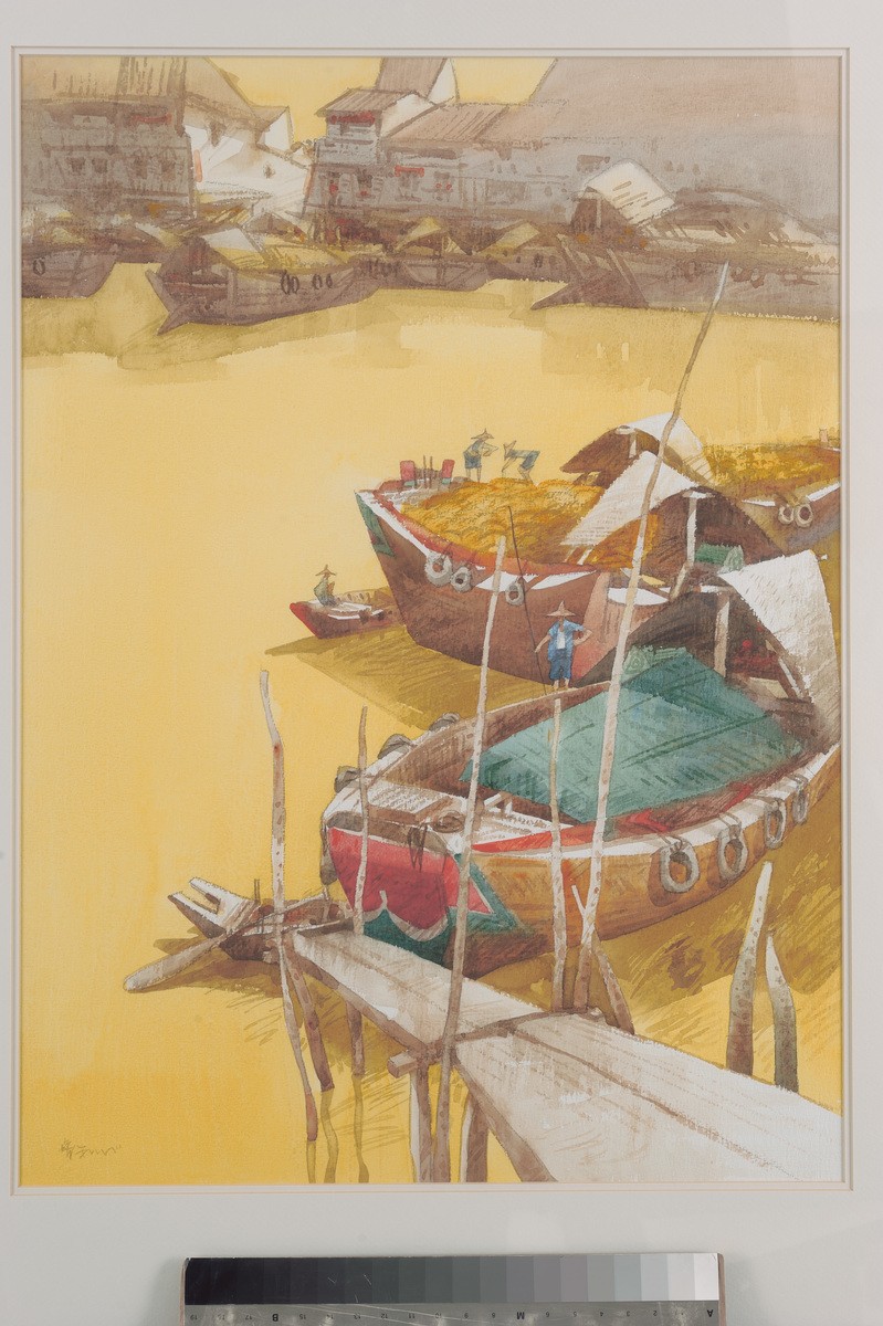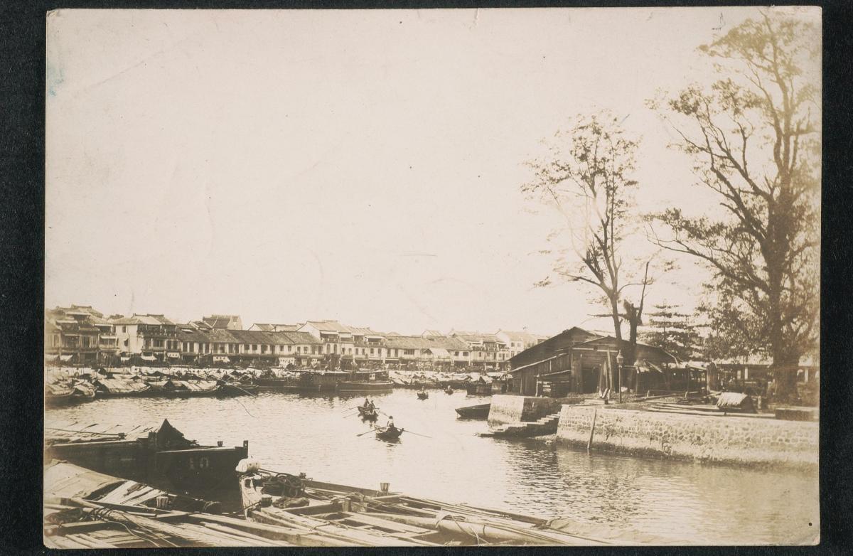 This postcard depicts a bustling scene of Boat Quay teeming with men at work on the boats parked cheek by jowl at the harbour, with rows of godowns (warehouses) situated along the river bank. Boat Quay was the hub of economic activity in Singapore in the early 20th century. The area was developed on reclaimed land. Earth was transported from a small hill in Battery Road to fill up the originally swampy area in the early 1820s. The boats pictured here, called ‘tongkang’ were crewed by Indian and Chinese lightermen. They were the main cargo-carrying craft used along the Singapore River up to 1900, when Chinese-manned ‘twakow’ began to dominate the lighter business. The tongkang’s appearance took after that of vessels found in South India, which had a rounded hull and double-ended bow. These vessels were initially propelled using oars and punt poles before the introduction of sail in the 1860s. Despite the introduction of motor engines in the 1930s, the tongkang remained unconverted and had to subsequently rely on motorised barges to pull them along.