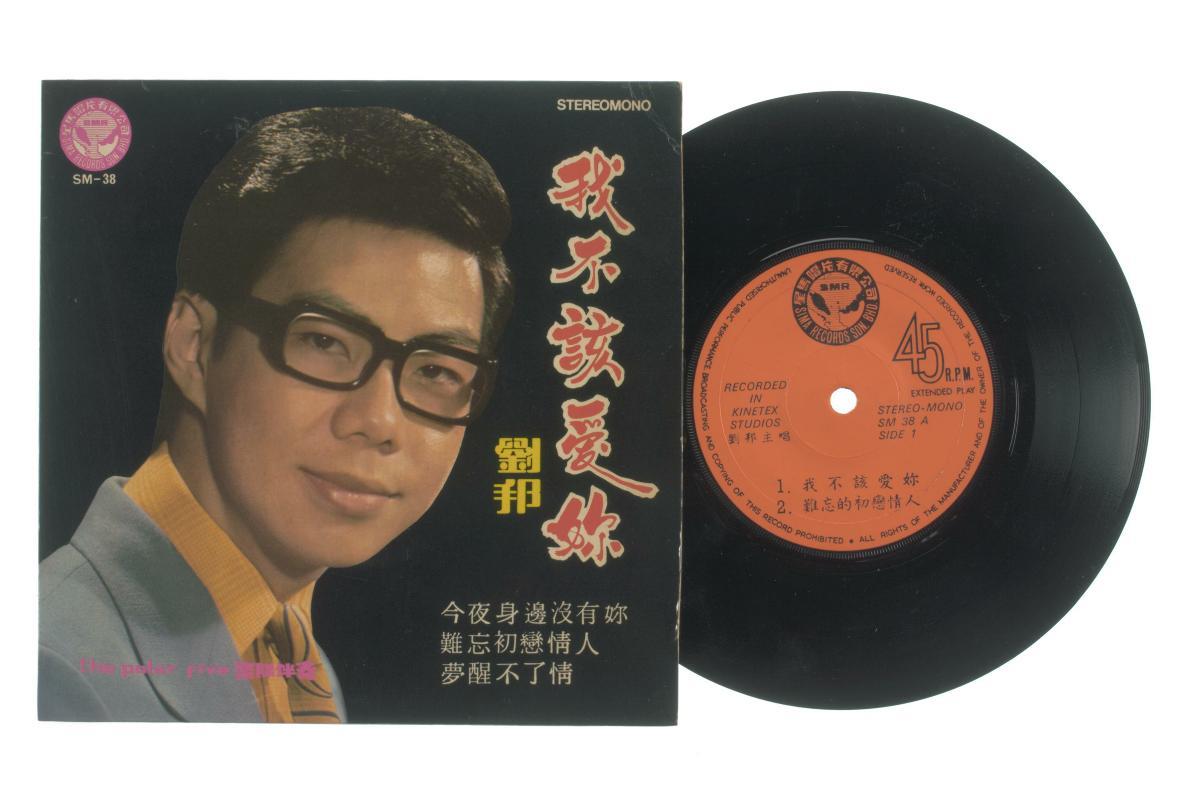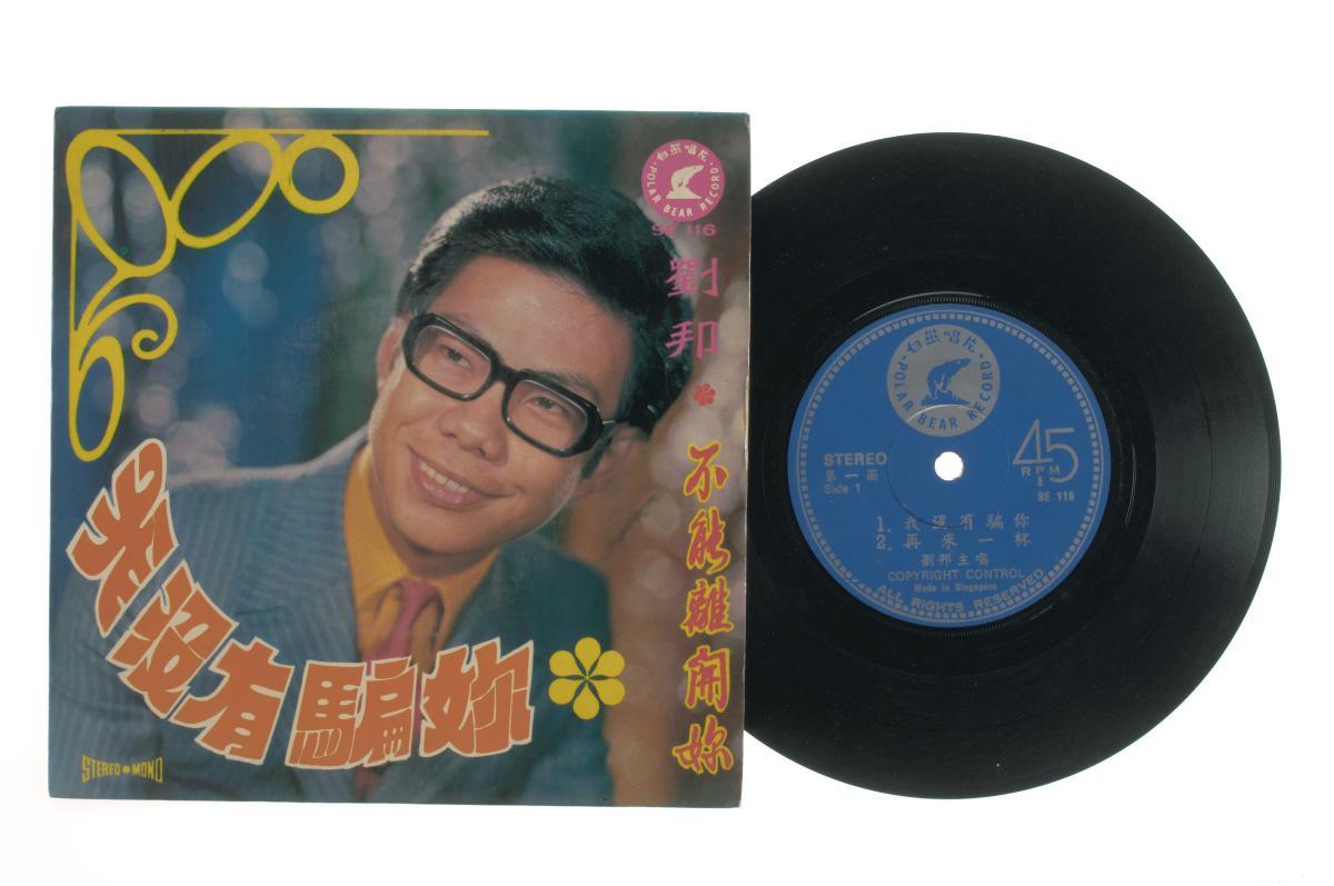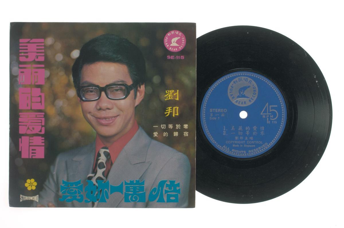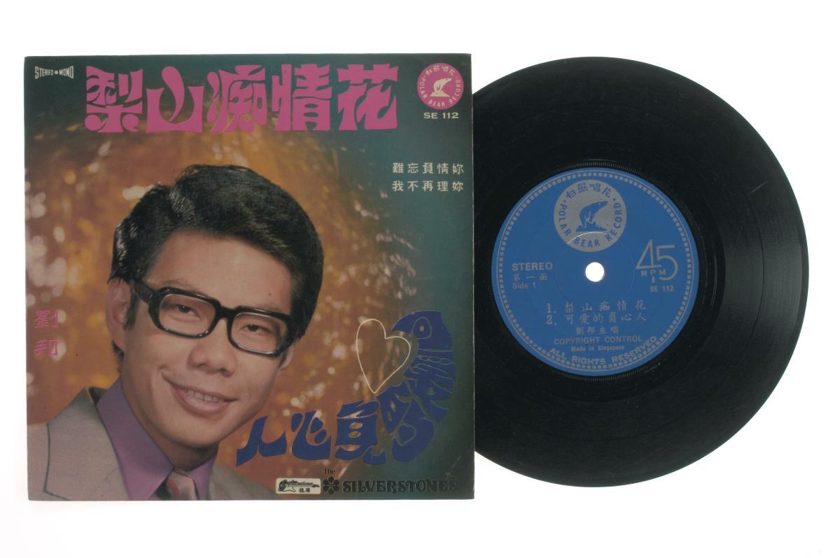 This 45 rpm record was produced by Sima Records. Liou Bang emerged as the champion in a singing competition held by the Kreta Ayer People’s Theatre in 1969. He was nicknamed ‘King of Pop of Kreta Ayer’.