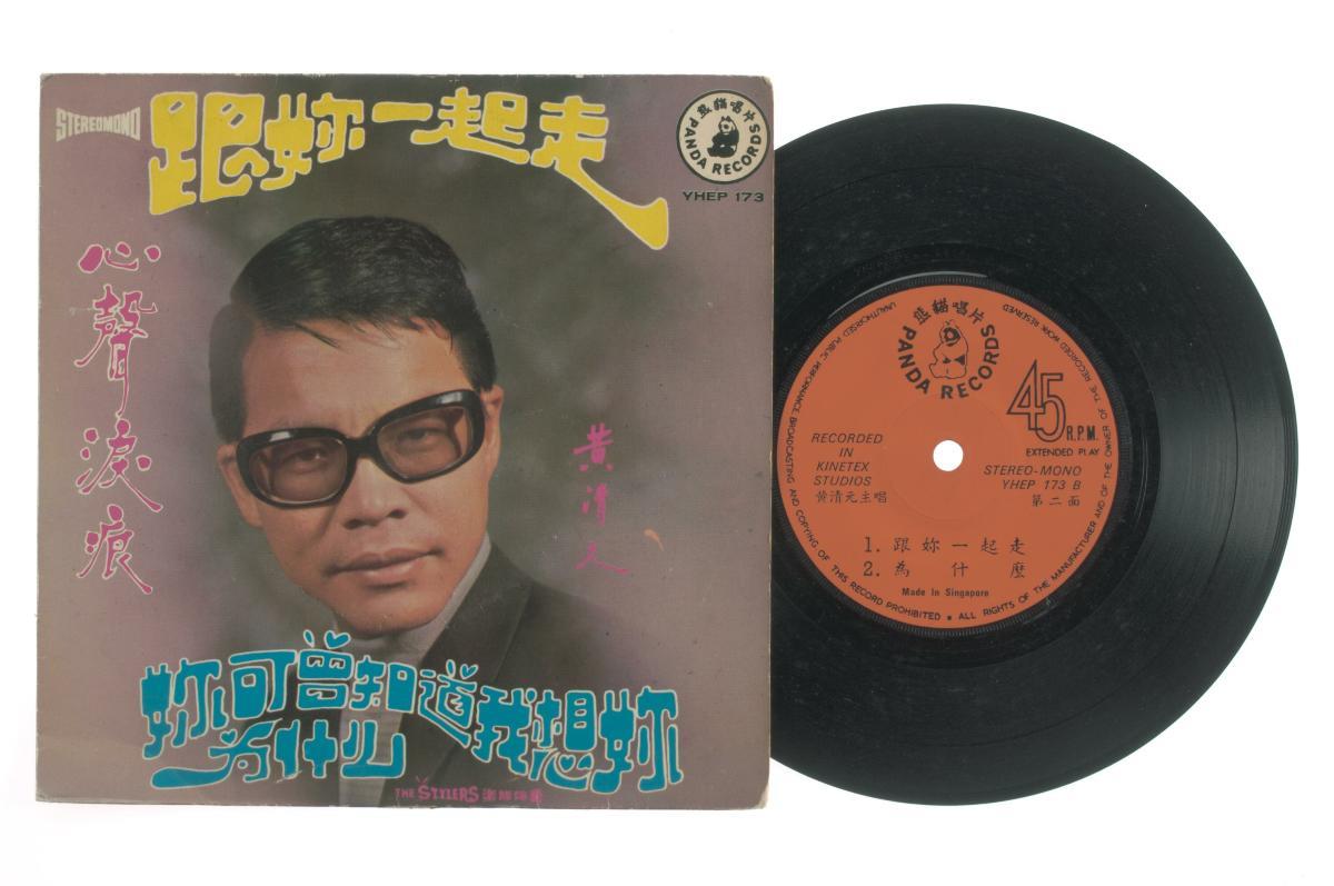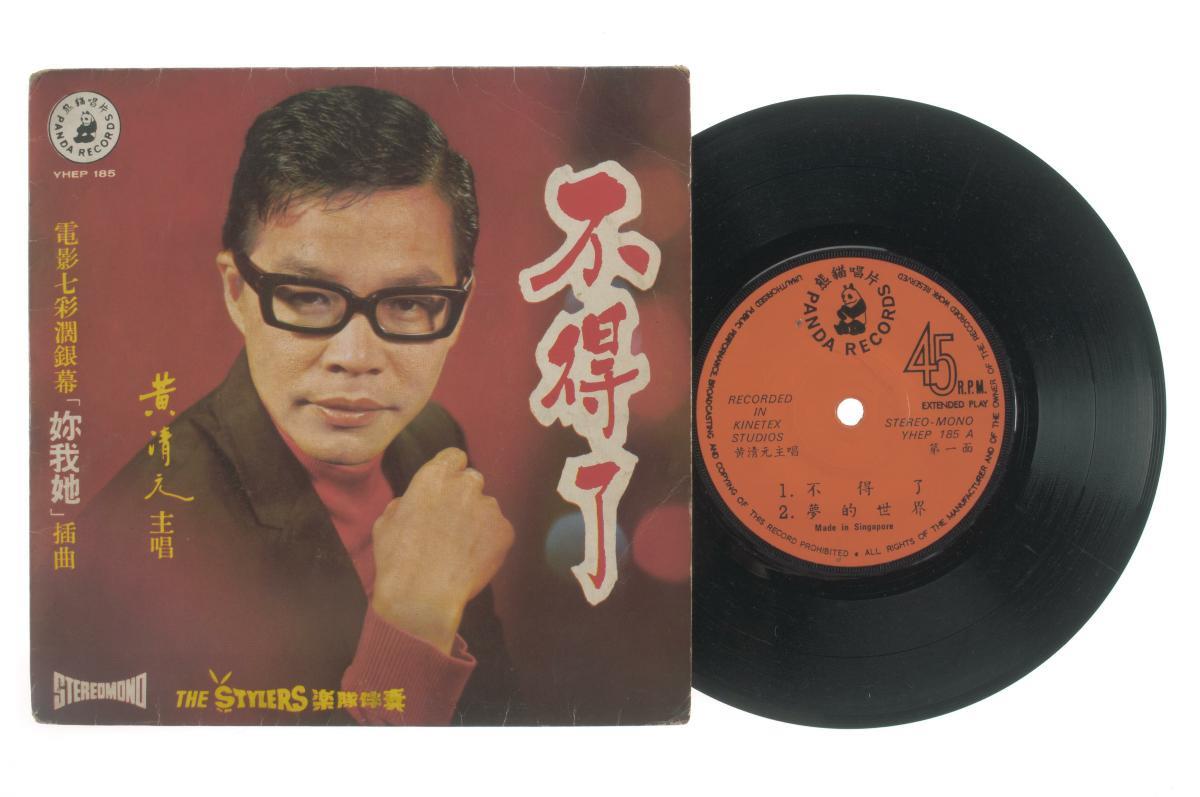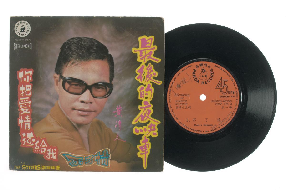 This 45 rpm record was produced by Panda Records.With a singing career that spanned more than 40 years, the name Huang Qing Yuan or Wong Ching Yian will ring a bell to those who remember the local popular music scene of the 1960s and 1970s. In 1965, Huang won the singing competition organised by the Ministry of National Development in which he sang 'Serenade of the Green Island’ (《绿岛小夜曲》, Ludao Xiaoyequ), a Chinese classic. Huang’s fame soared and he went on to release several records thereafter.