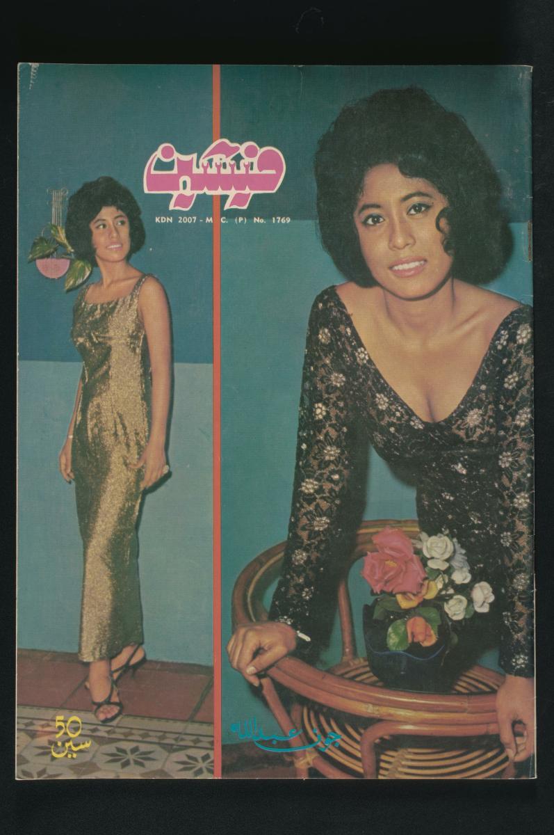 The cover of this Malay fashion magazine features the image of a famous Malay actress, Latifah Omar. Latifah Omar was born in Kuala Lumpur, Malaysia, in 1939. She received her big break in the film ‘Panggilan Pulau’ (1954), acting alongside film legend P. Ramlee. The film made her into a household name and started her immensely successful career as an actress at Malay Film Productions and later at Cathay-Keris Productions. Her other films include ‘Bawang Putih Bawang Merah’ (1959), ‘Hang Jebat’ (1961) and ‘Laila Majnun’ (1962).