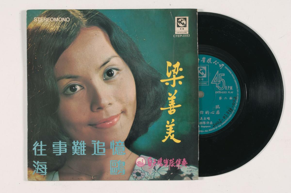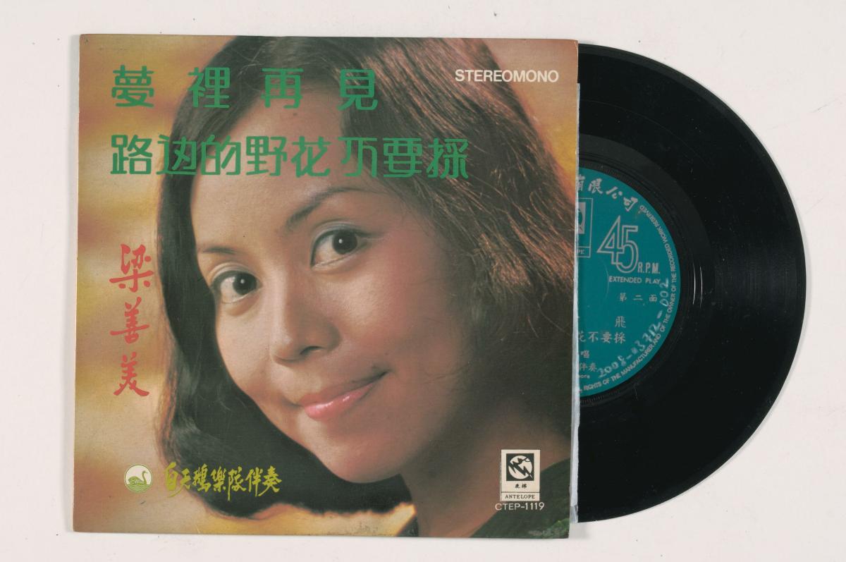 This Chinese vinyl record features songs by singer Mimi Leong (梁善美, Liang Shan Mei), with accompanying music by the band The Silverstones (银石乐队, Yinshiyuedui). The 45 rpm record was produced by KLC Records (昆仑唱片有限公司, Kunlunchangpianyouxiangongsi).
