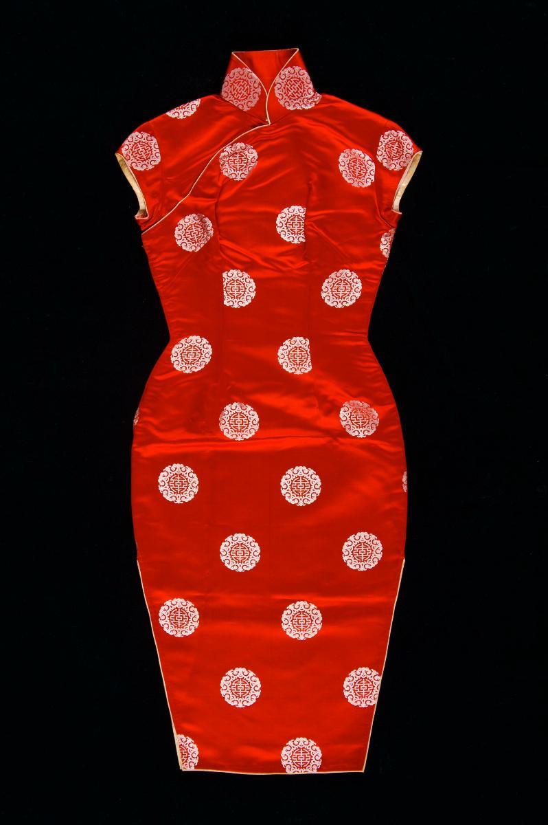 This is an example of a bridal costume worn during the traditional 12 day Peranakan Chinese wedding. It is a T-shaped garment with broad, straight sleeves that are broad, heavy and long. It is possibly made of silk, and richly embroidered with auspicious symbols in silk and gold thread couching. At the centre of the costume is a panel featuring the phoenix and lotus flowers. The phoenix can represent beauty, grace, high virtue, the Empress and the bride while the lotus symbolises elegance, beauty, perfection, purity and grace, virtues considered as ideal female attributes. Other motif on this piece includes the goldfish which symbolises abundant wealth. The bride was expected to strike a formal pose which required her to fold her hands in front of her and adjust the ends of the two sleeves in such a way that one slips into the other.