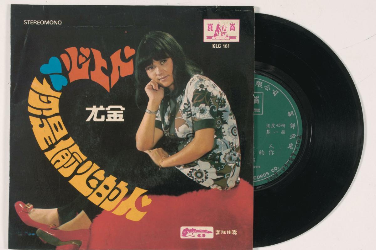 This Chinese vinyl record features songs by singer You Jin (尤金), with accompanying music by the band The Silverstones (银石乐队, Yinshiyuedui). The 45 rpm record was produced by KLC Records (昆仑唱片有限公司, Kunlunchangpianyouxiangongsi).