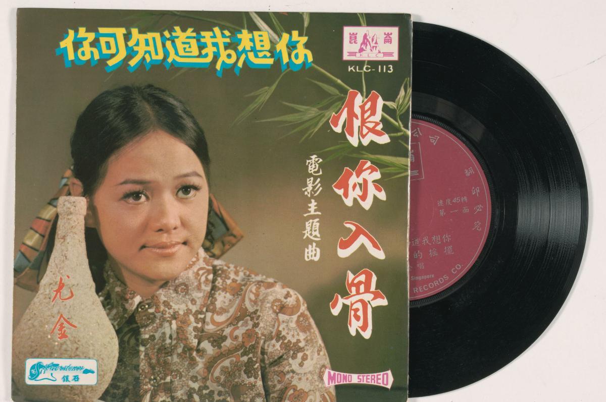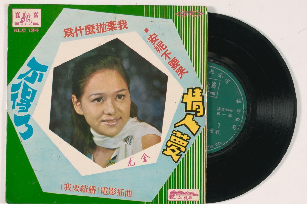 This Chinese vinyl record features songs by singer You Jin (尤金), with accompanying music by the band The Silverstones (银石乐队, Yinshiyuedui). The 45 rpm record was produced by KLC Records (昆仑唱片有限公司, Kunlunchangpianyouxiangongsi).