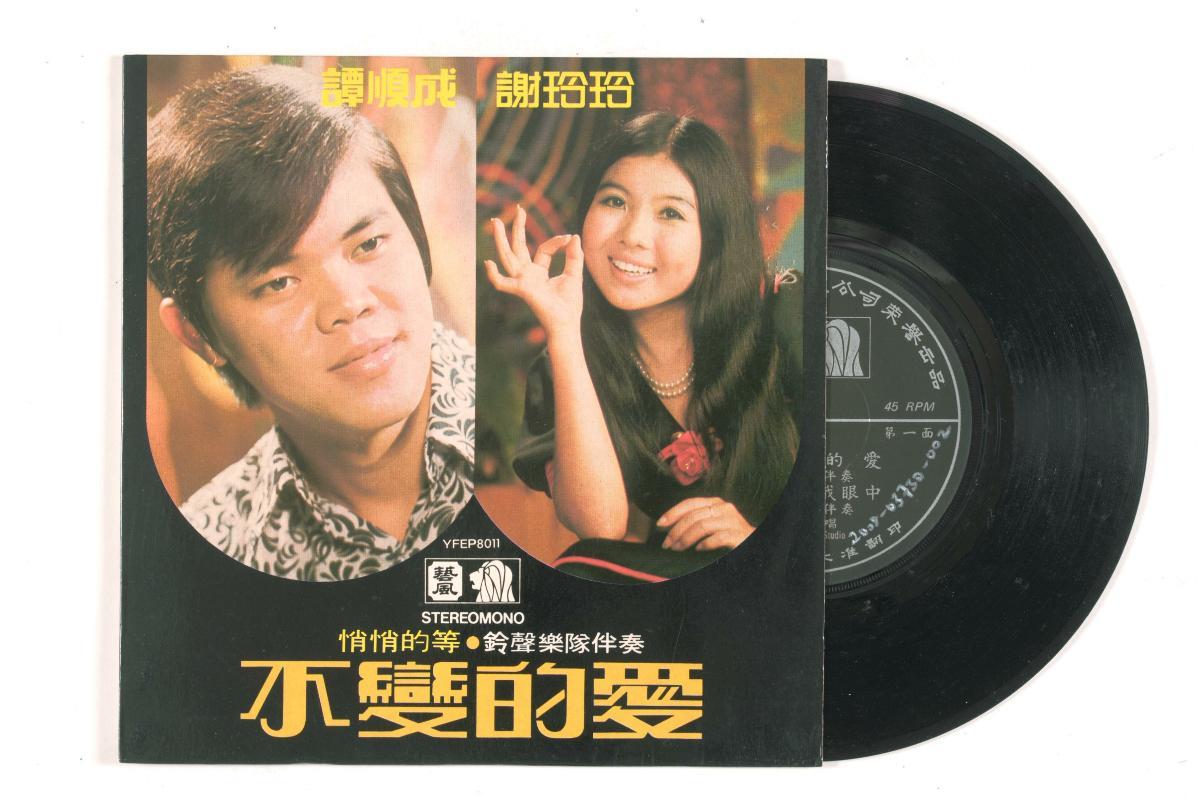 This Chinese vinyl record features songs by singer Tan Shun Cheng (谭顺成), with accompanying music by the band Ringtones (铃声乐队, Lingshengyuedui). The 45 rpm record was produced by the Hong Kong-based LIFE Records (香港丽风唱片有限公司, Xiangganglifengchangpianyouxiangongsi).