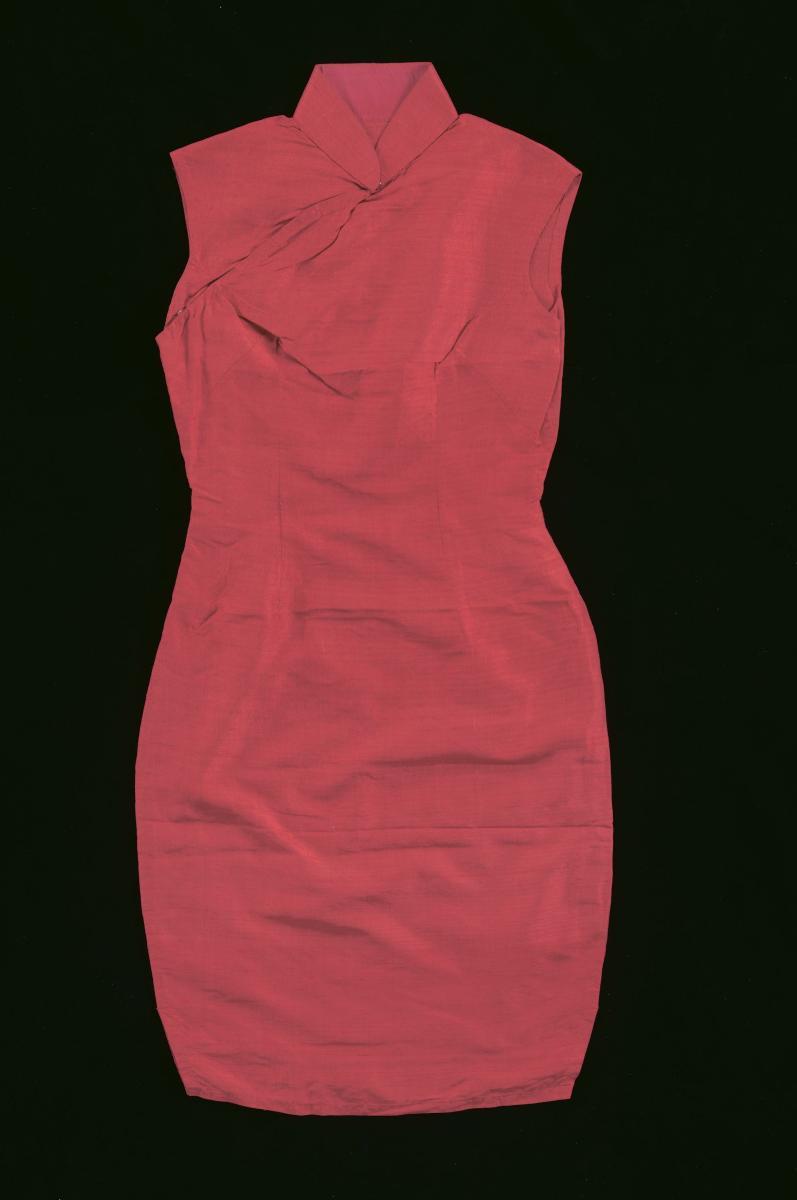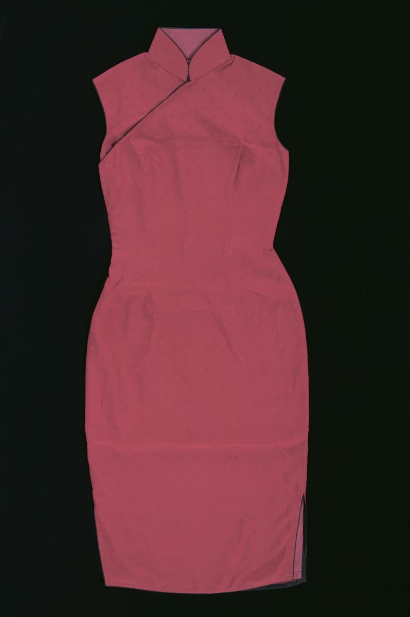 This is a red laced long-sleeve jacket of a purple sleeveless cheongsam (2008-06194). It is decorated with red and yellow floral motifs allover. It has a V-shape neckline and cream coloured pipping on the collar, sleeves and right flap. This belonged to Datin Aw Cheng Hu. Born in 1914, she was the daughter of Mr Aw Boon Par. She wore this cheongsam when she was in her late 40s and 50s. Datin Aw would personally select her fabrics from Modern Silk Store and Chotirmall along High Street, Singapore, before sending them to Shanghainese tailors who were sought after for their cheongsam making skills.