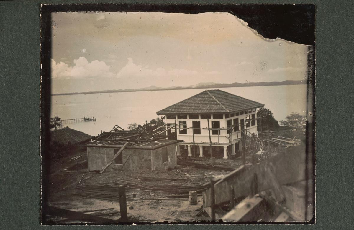 A man standing in front of the Asiatic Petroleum Company building on Pulau Bukom