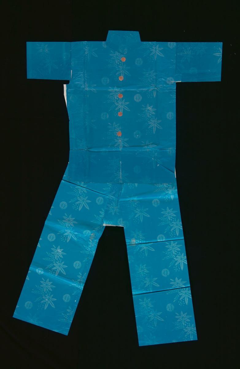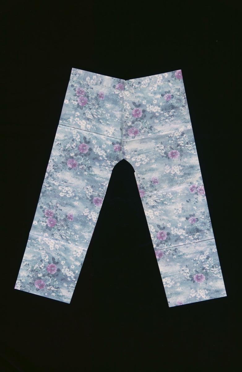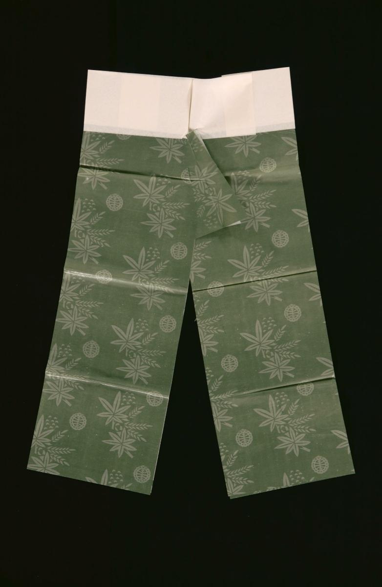 This pair of paper pants is burnt as an offering to a male ancestor or deceased. Burnt offerings are integral to Taoist worship and rituals. Offerings are burnt as gifts during temple festivals to commemorate the birthdays of deities. At Taoist funerals and religious ceremonies, burnt offerings are made to ensure that the deceased, or an ancestor, enjoys a comfortable life in the netherworld. The articles burnt as offerings are made from paper and are often imitations of real objects. They can be purchased from shops dedicated to selling these religious paraphernalia, which are referred to locally as “paper shops”. These shops sell a wide range of items, from elaborately decorated paper houses, cars and furniture, to bank notes and garments. The paper garments are usually life-size and the more elaborate ones follow the iconographic conventions of opera costumes closely. Chinese operas are performed as part of Taoist religious festivities.