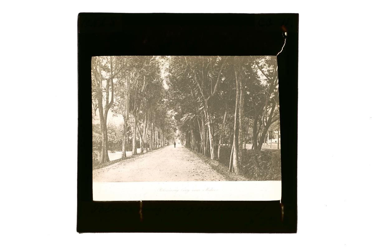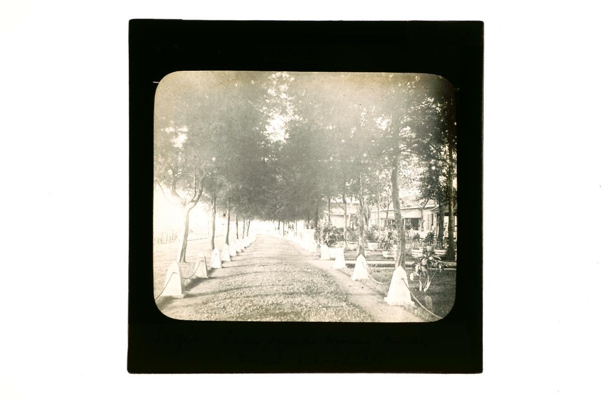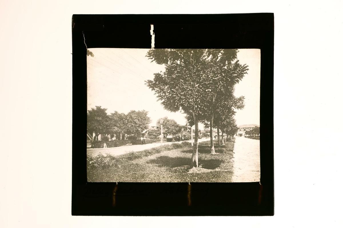 A glass lantern slide depicting a street scene in a residential district