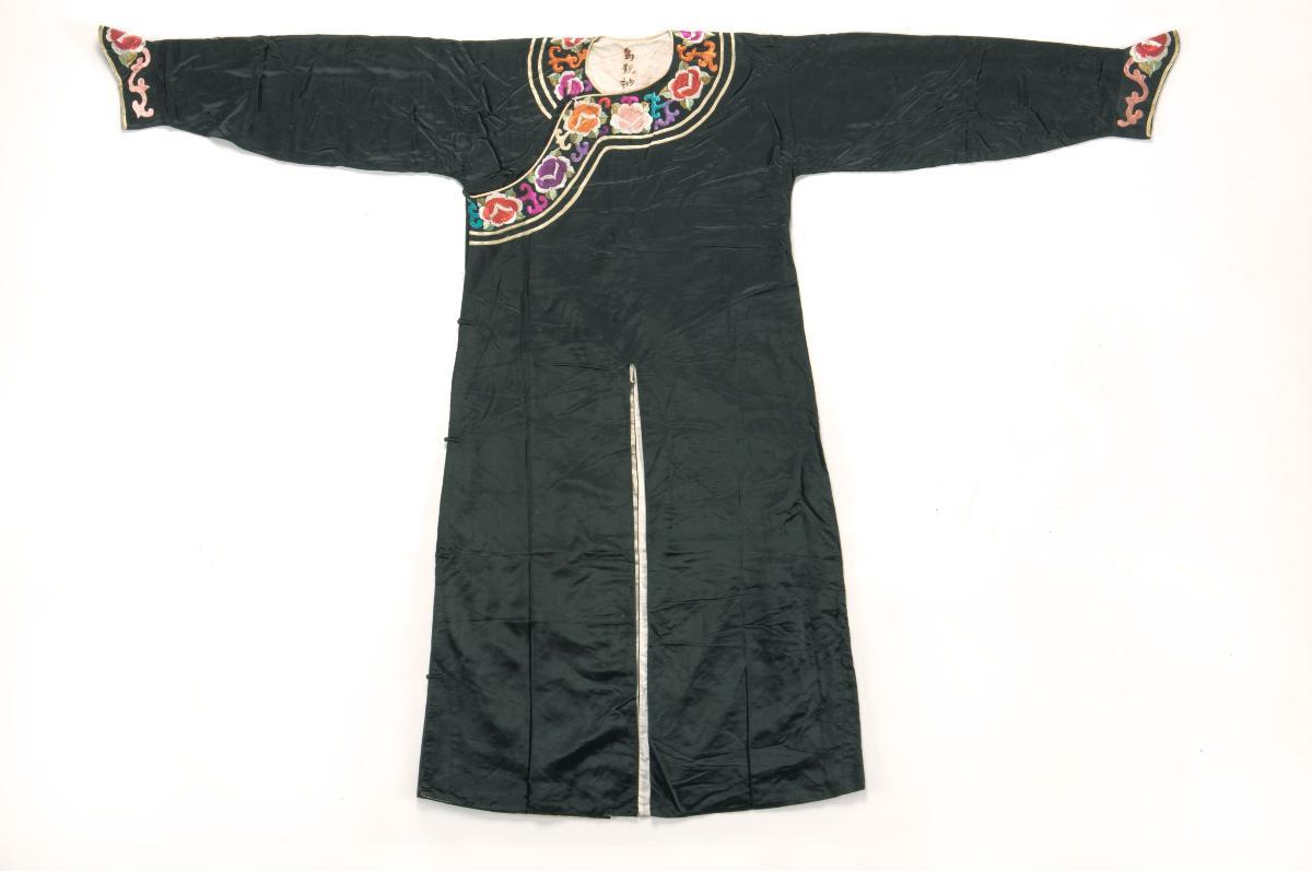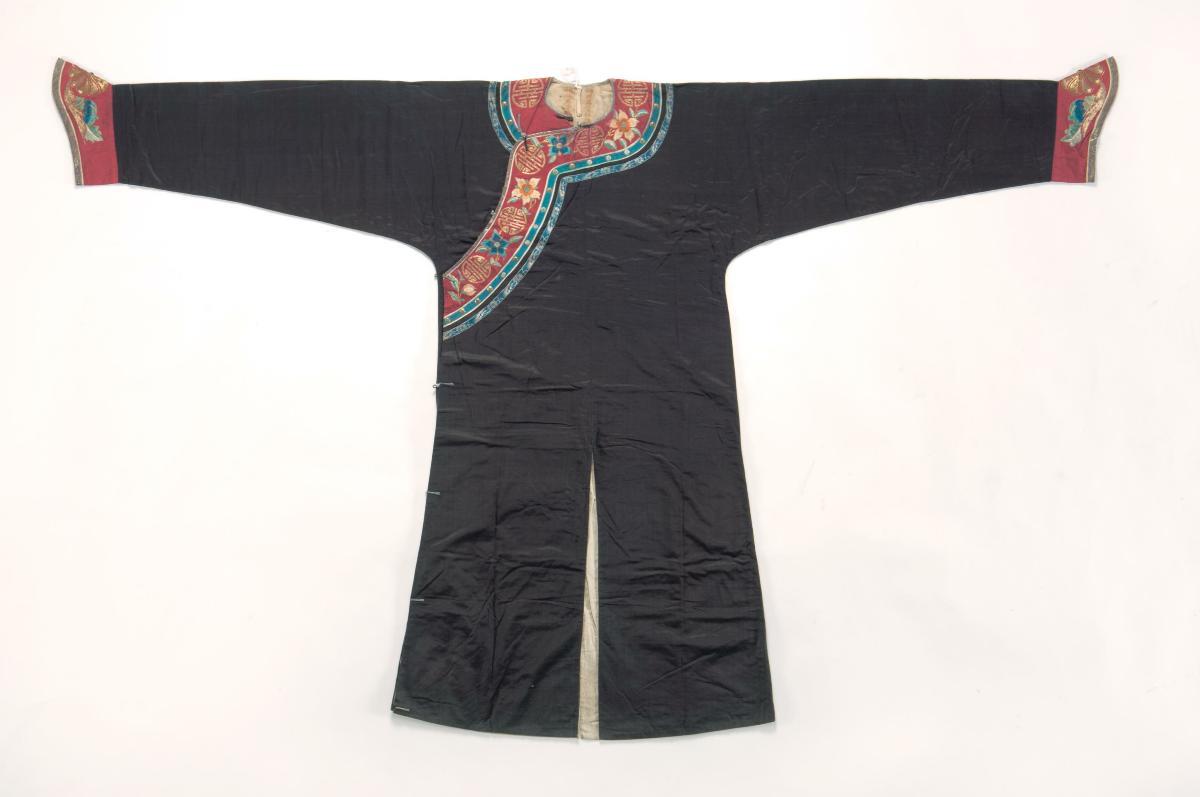 This black shawl with floral embroidery is worn with a cheongsam.The cheongsam is a ubiquitous Chinese dress that first gained popularity in China in the early 20th century. Feted for its feminine charm, the dress was an essential part of women’s everyday wear up till the 1960s. It is usually bespoked to ensure a fitted silhouette and its distinctive features include a high collar, side slits at the hem and a decorative knot and loop fastener for the collar or shoulder flap, called the ‘hua niu’.The cheongsam has its origins in the long and loose-fitting robes worn by the Manchu women of the Qing Dynasty, called the “banner gown” (‘qipao’). Initially worn loose and long in the 1920s and 1930s, the cheongsam had evolved by the 1940s and 1950s to become shorter and more form-fitting. Although its popularity was overtaken by mass-produced, Western-style garments during the 1970s and 1980s, the dress experienced a fashion renaissance in the 1990s when it became the inspiration for some of the runway collections created by various internationally-renowned fashion designers. Today, the cheongsam remains a subject of reinterpretation and its style is constantly being updated.
