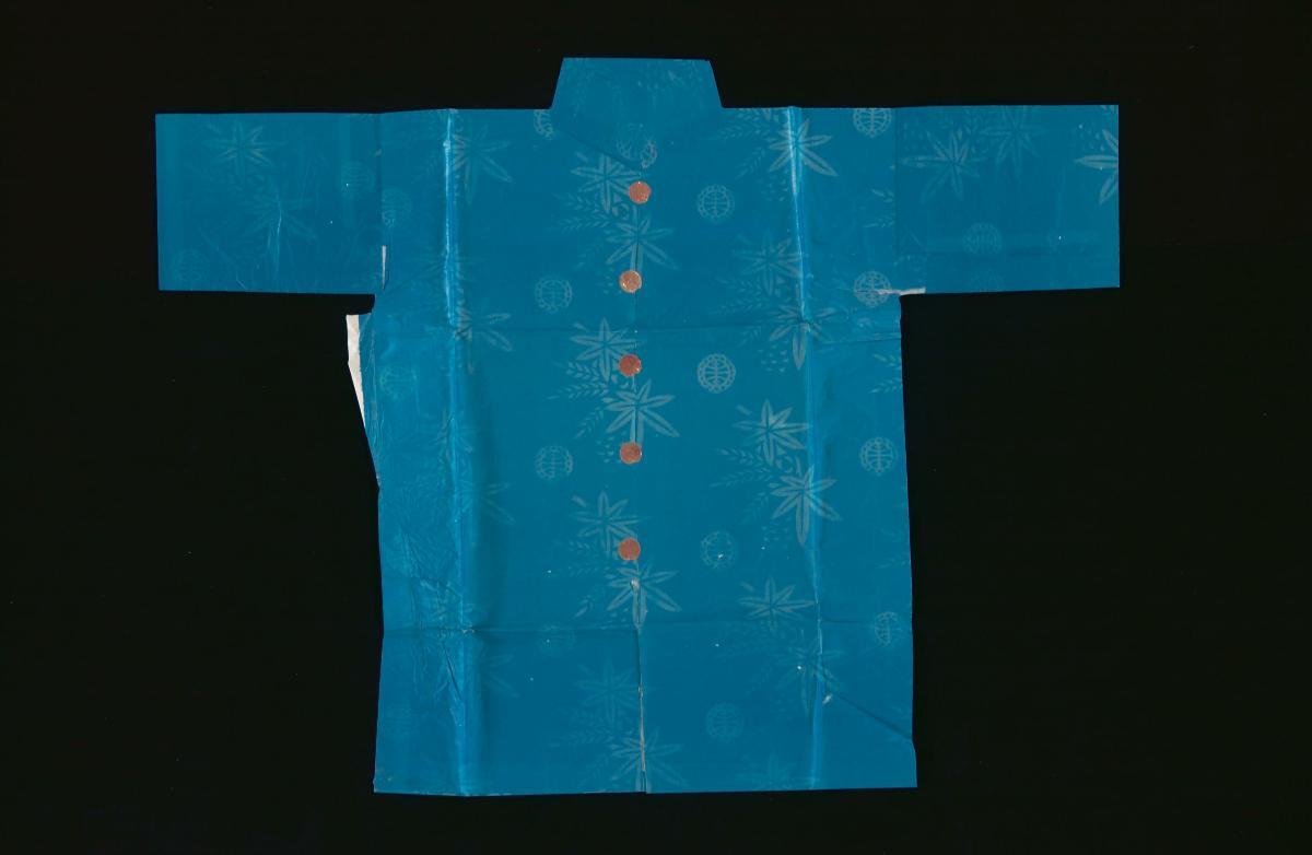 This paper shirt is burnt as an offering to a male ancestor or deceased. Burnt offerings are integral to Taoist worship and rituals. Offerings are burnt as gifts during temple festivals to commemorate the birthdays of deities. At Taoist funerals and religious ceremonies, burnt offerings are made to ensure that the deceased, or an ancestor, enjoys a comfortable life in the netherworld. The articles burnt as offerings are made from paper and are often imitations of real objects. They can be purchased from shops dedicated to selling these religious paraphernalia, which are referred to locally as “paper shops”. These shops sell a wide range of items, from elaborately decorated paper houses, cars and furniture, to bank notes and garments. The paper garments are usually life-size and the more elaborate ones follow the iconographic conventions of opera costumes closely. Chinese operas are performed as part of Taoist religious festivities.