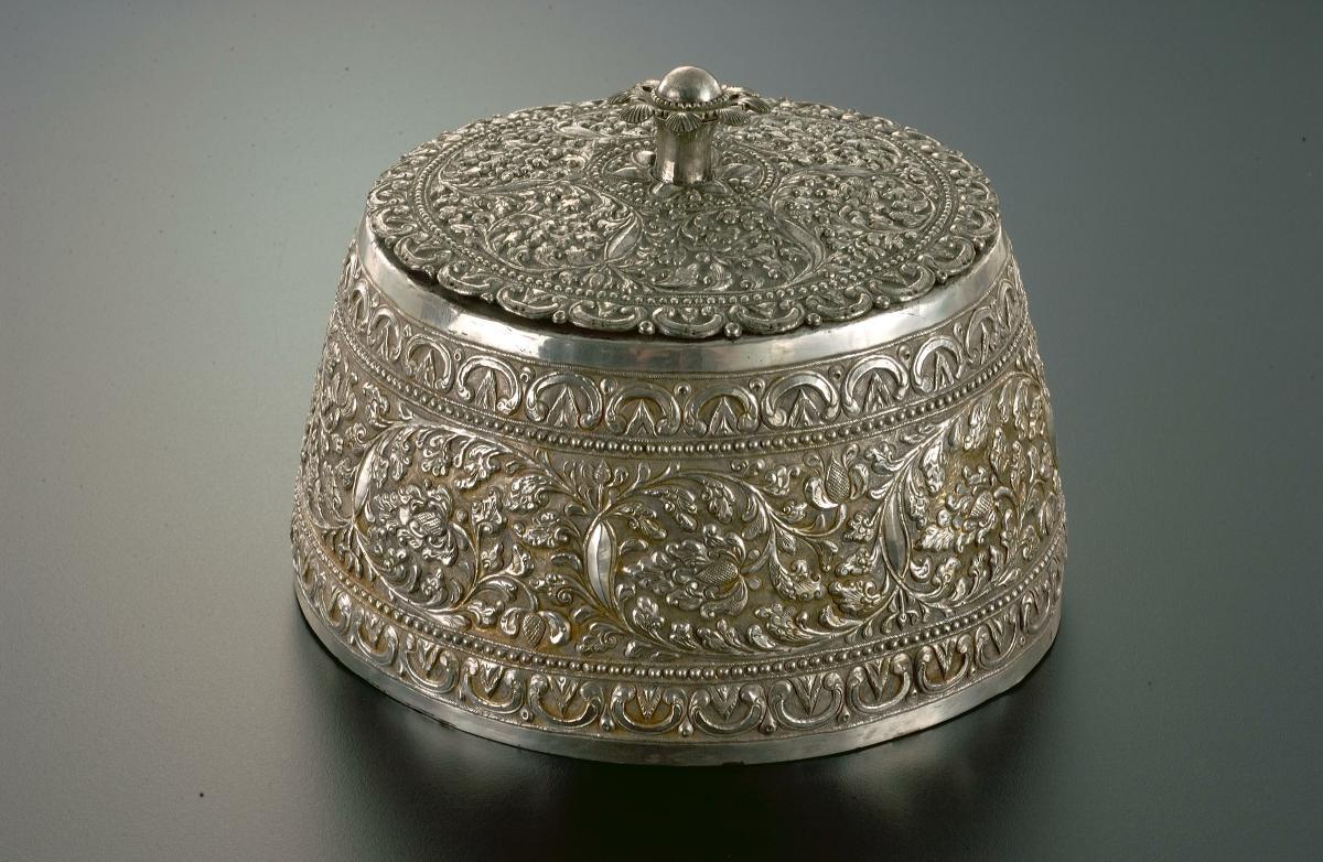This headgear or ‘songkok’ is made of finely woven palm fibre and gold threads. The name Muhammad, which refers to the Prophet of Islam, can be seen woven in white. This songkok would have been worn by a Bugis prince. The width of the gold band indicates the wearer’s relationship to the King. The broadest gold band was reserved for the son who would inherit the throne. Slimmer bands, as shown on this piece, were worn by other princes. The songkok was traditionally worn during Friday prayers at the mosque. The black-coloured songkok would be switched for a white one once the prince has performed the pilgrimage to Mecca.