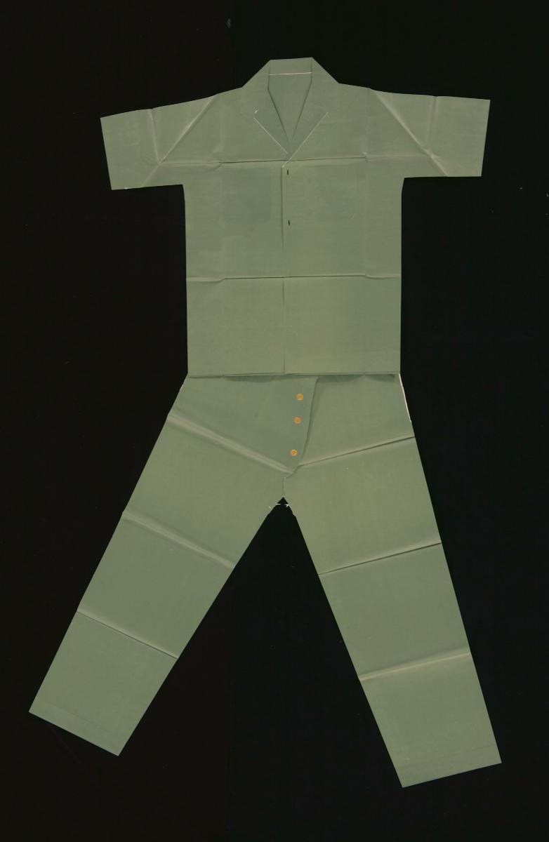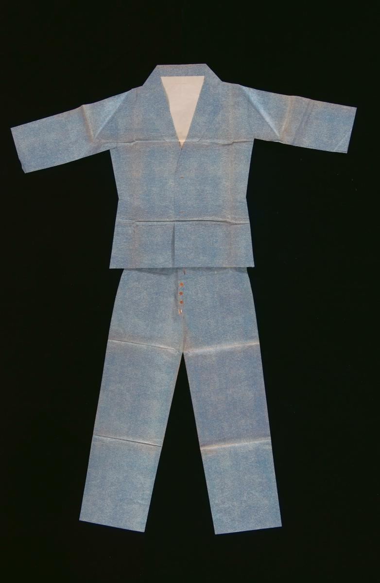 This paper ensemble comprising of a shirt and a pair of pants is burnt as an offering to a male ancestor or deceased. Burnt offerings are integral to Taoist worship and rituals. Offerings are burnt as gifts during temple festivals to commemorate the birthdays of deities. At Taoist funerals and religious ceremonies, burnt offerings are made to ensure that the deceased, or an ancestor, enjoys a comfortable life in the netherworld. The articles burnt as offerings are made from paper and are often imitations of real objects. They can be purchased from shops dedicated to selling these religious paraphernalia, which are referred to locally as “paper shops”. These shops sell a wide range of items, from elaborately decorated paper houses, cars and furniture, to bank notes and garments. The paper garments are usually life-size and the more elaborate ones follow the iconographic conventions of opera costumes closely. Chinese operas are performed as part of Taoist religious festivities.