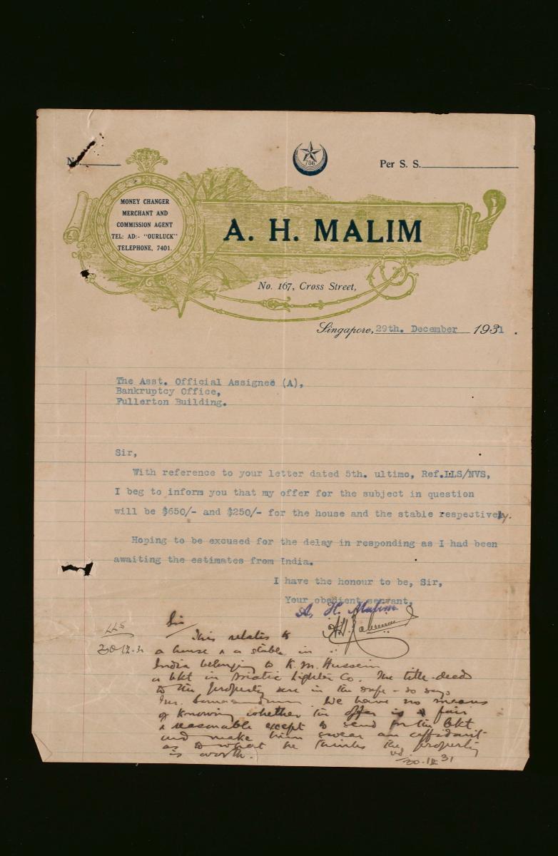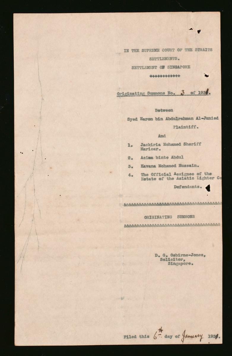 Court document pertaining to Syed Haron Bin Abdul Rahman Aljunied’s purchase of ‘tongkangs’ (local boats) and cargo boats from an auction sale