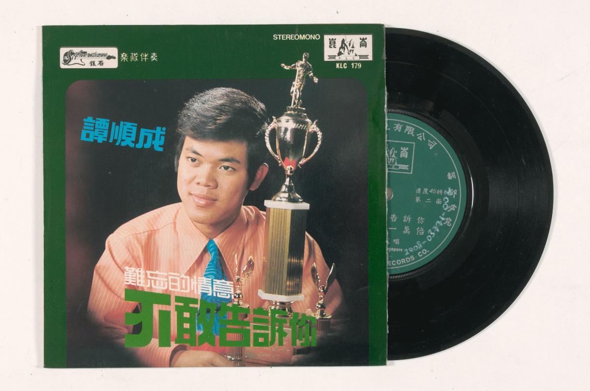 This Chinese vinyl record features songs by singer Tan Shun Cheng (谭顺成), with accompanying music by the band The Silverstones (银石乐队, Yinshiyuedui). The 45 rpm record was produced by KLC Records (昆仑唱片有限公司, Kunlunchangpianyouxiangongsi).