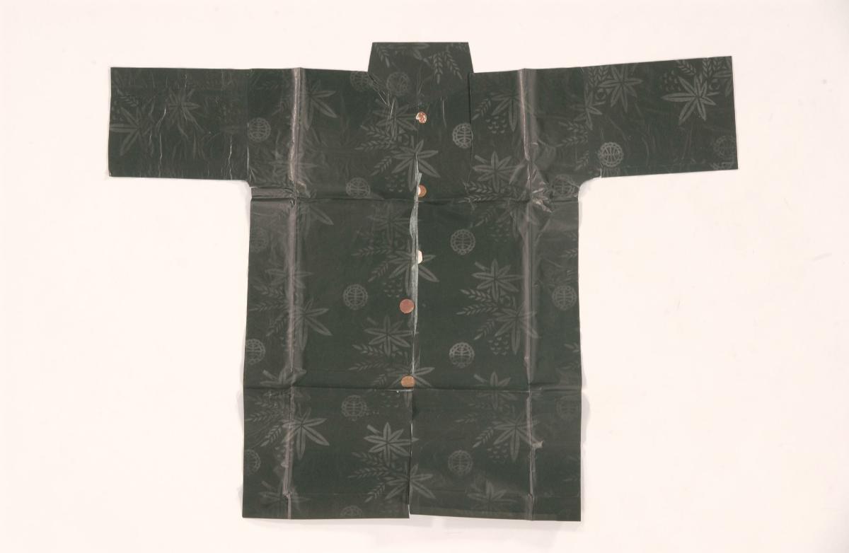 This paper ensemble comprising of a shirt and a pair of pants is burnt as an offering to a male ancestor or deceased. Burnt offerings are integral to Taoist worship and rituals. Offerings are burnt as gifts during temple festivals to commemorate the birthdays of deities. At Taoist funerals and religious ceremonies, burnt offerings are made to ensure that the deceased, or an ancestor, enjoys a comfortable life in the netherworld. The articles burnt as offerings are made from paper and are often imitations of real objects. They can be purchased from shops dedicated to selling these religious paraphernalia, which are referred to locally as “paper shops”. These shops sell a wide range of items, from elaborately decorated paper houses, cars and furniture, to bank notes and garments. The paper garments are usually life-size and the more elaborate ones follow the iconographic conventions of opera costumes closely. Chinese operas are performed as part of Taoist religious festivities.